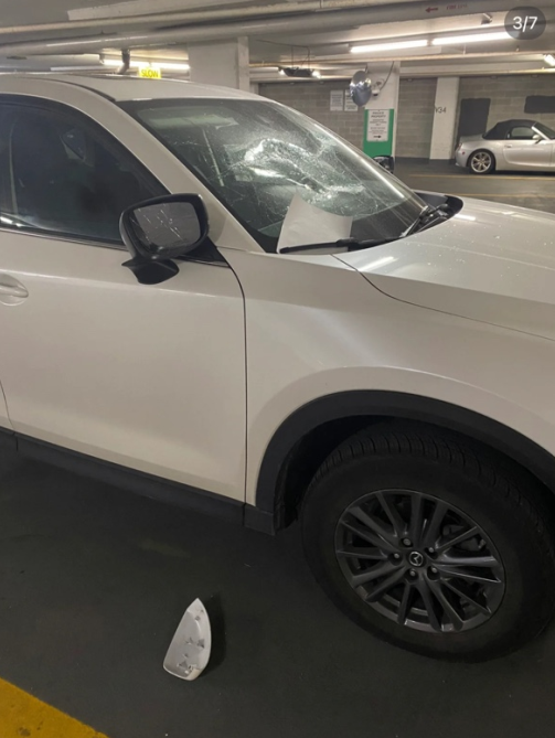 据作者称,他在现场只看到3辆受损的马自达汽车,但还有其他事故车位上留下一地玻璃渣。