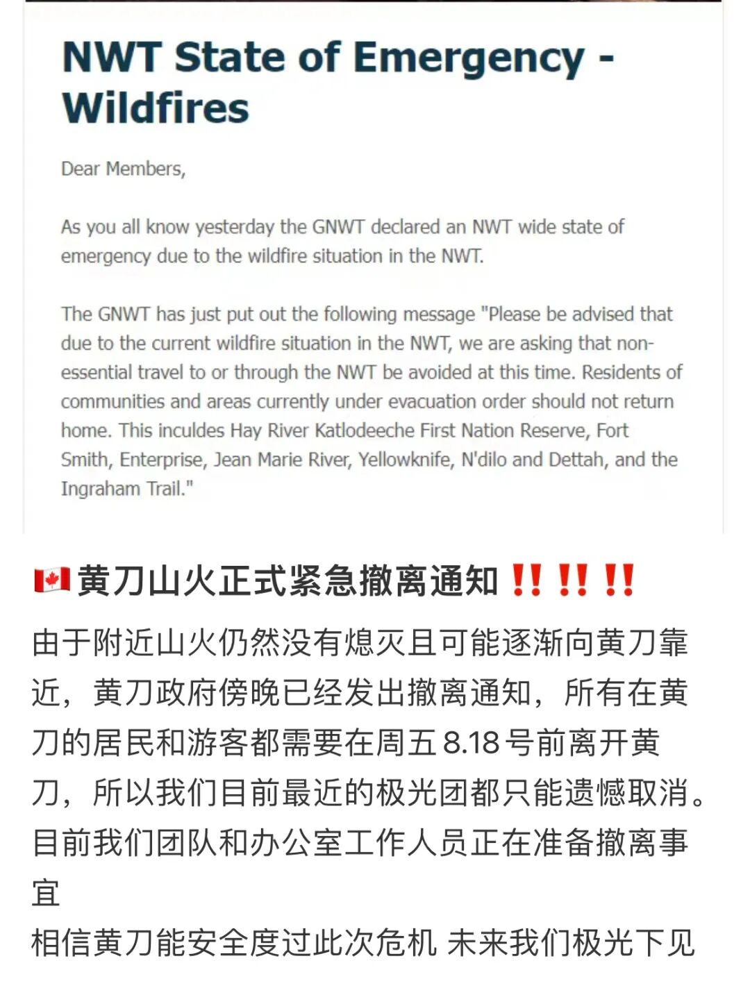 但已经有旅行社发帖称,“由于附近山火仍然没有熄灭且可能逐渐向黄刀靠近,黄刀政府傍晚已经发出撤离通知,所有在黄刀的居民和游客都需要在周五8.18号前离开黄刀,所以我们目前最近的极光团都只能遗憾取消。目前我们团队和办公室工作人员正在准备撤离事宜。”