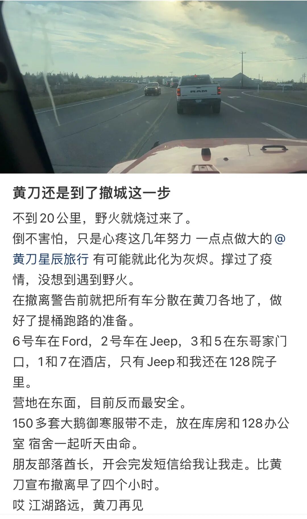 帖子写道,不到20公里,野火就烧过来了。倒不害怕,只是心疼这几年努力 一点点做大的@黄刀星辰旅行 有可能就此化为灰烬。
