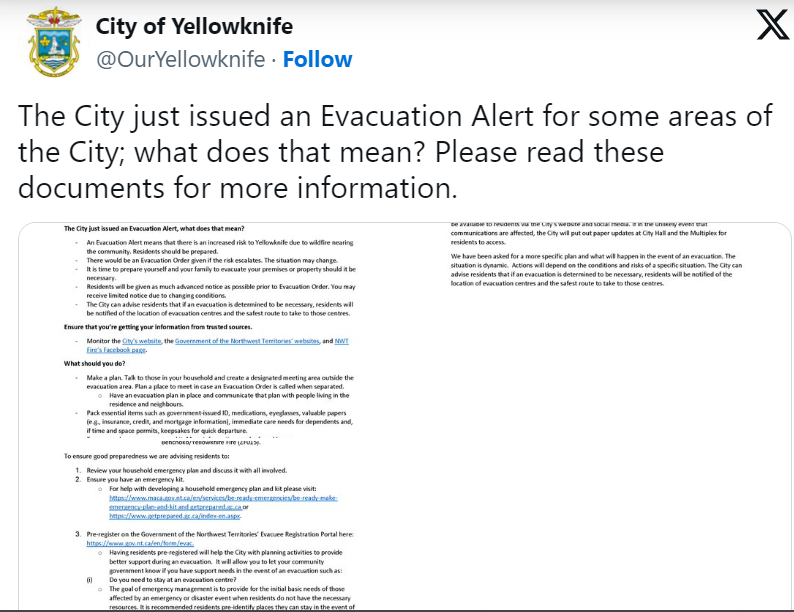 省政府表示,黄刀镇部分地区的居民应根据风险情况疏散。