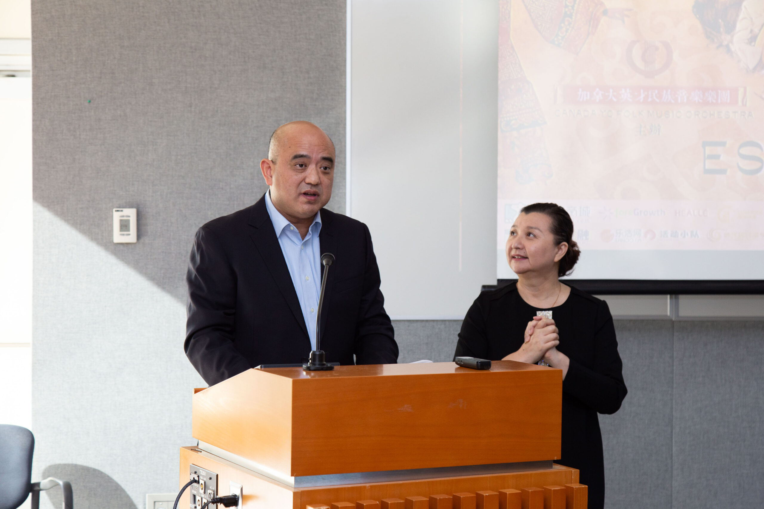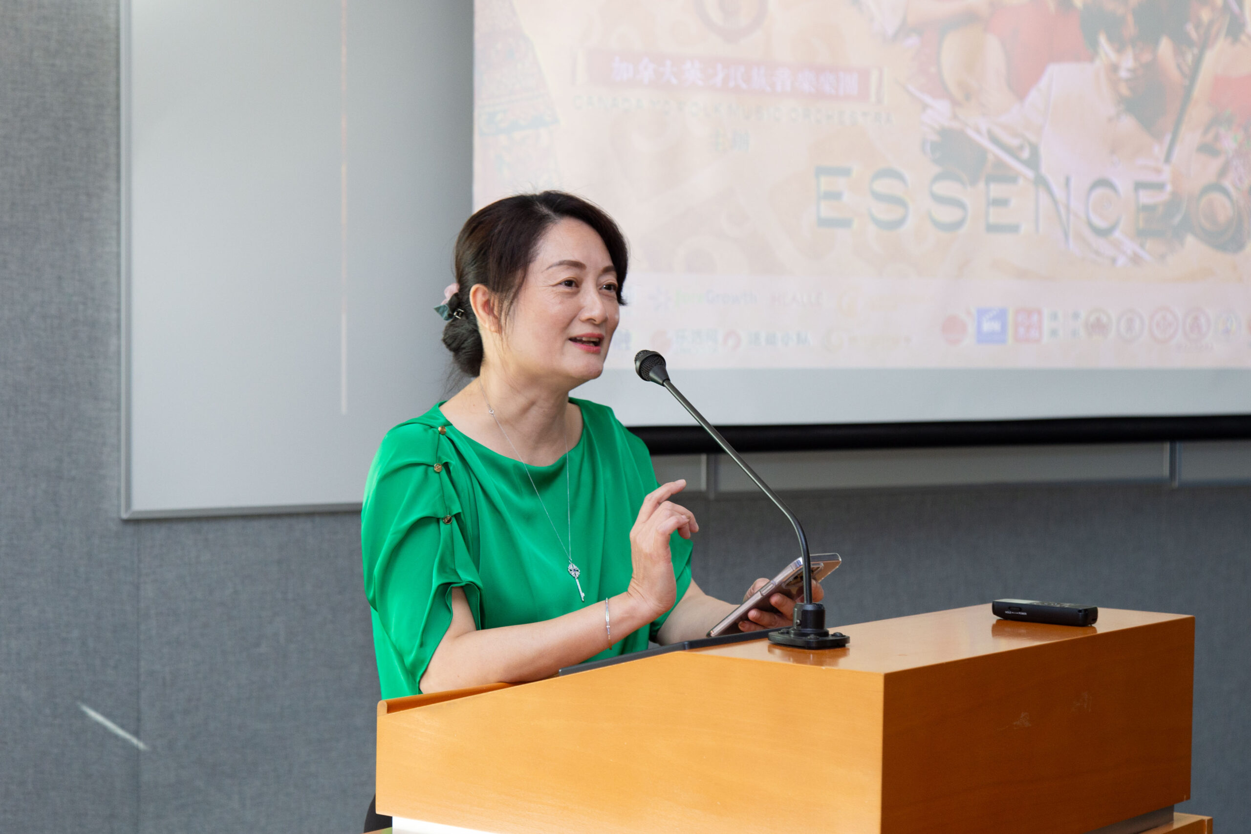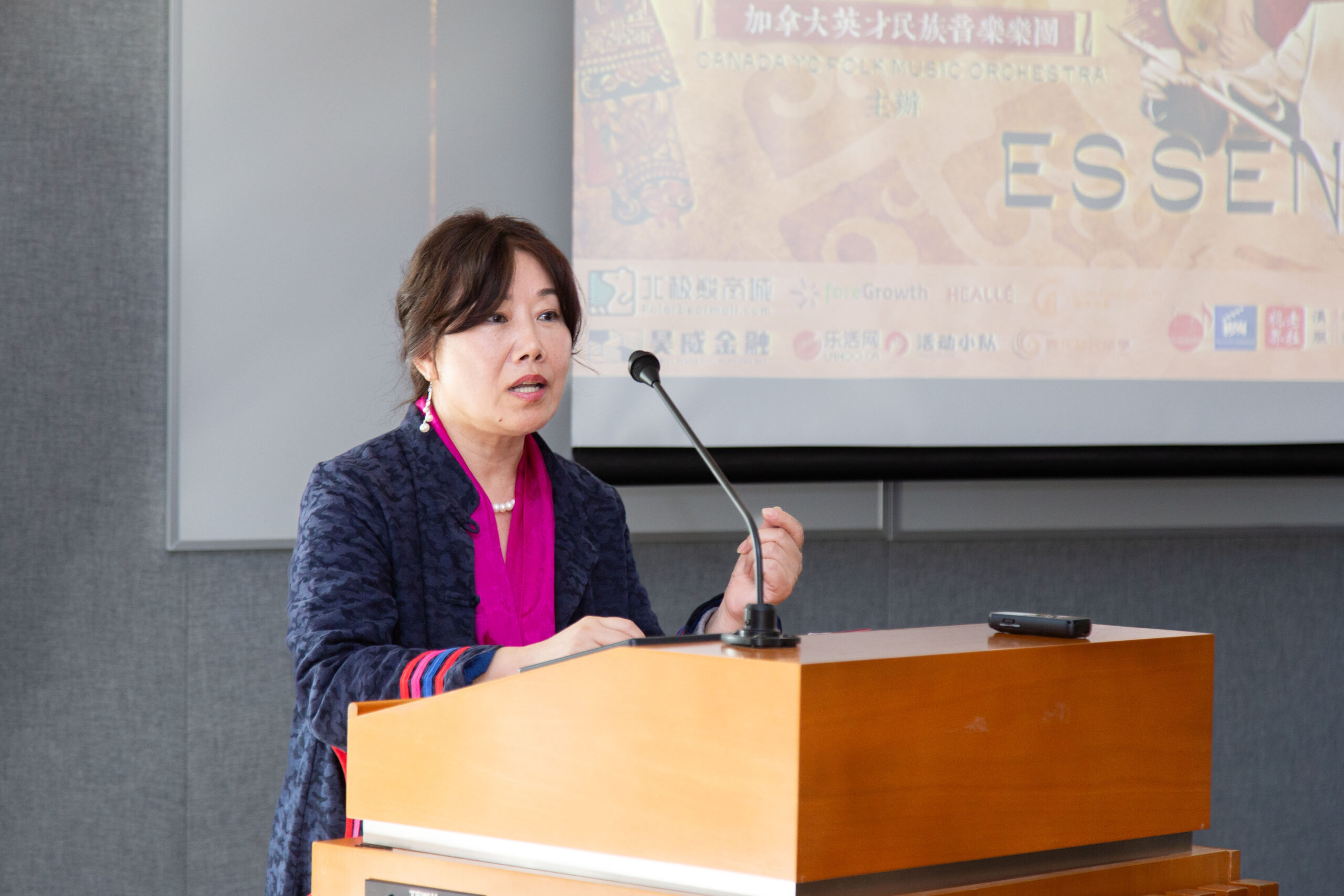 Sandy Chen 作为组委会主席,分享了她对中国民族音乐的热爱以及与杨老师和陈老师多年的友谊。她谈到了这次音乐会的目的,即希望可以将具有民族特色的音乐引入加拿大的多元文化中,并计划未来组织更多具有地方特色的音乐会,她还为现场嘉宾介绍了音乐会票务信息和赞助情况。