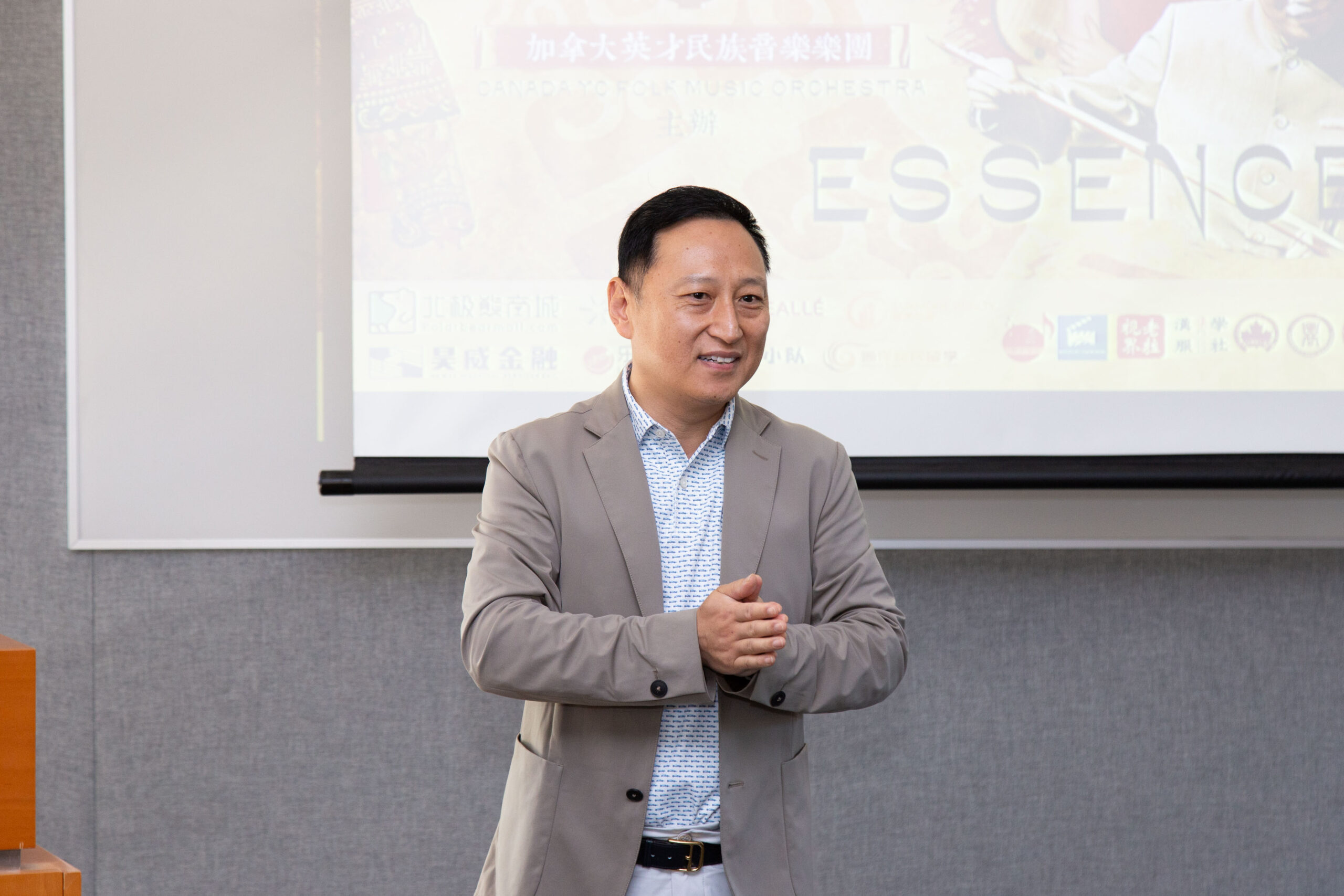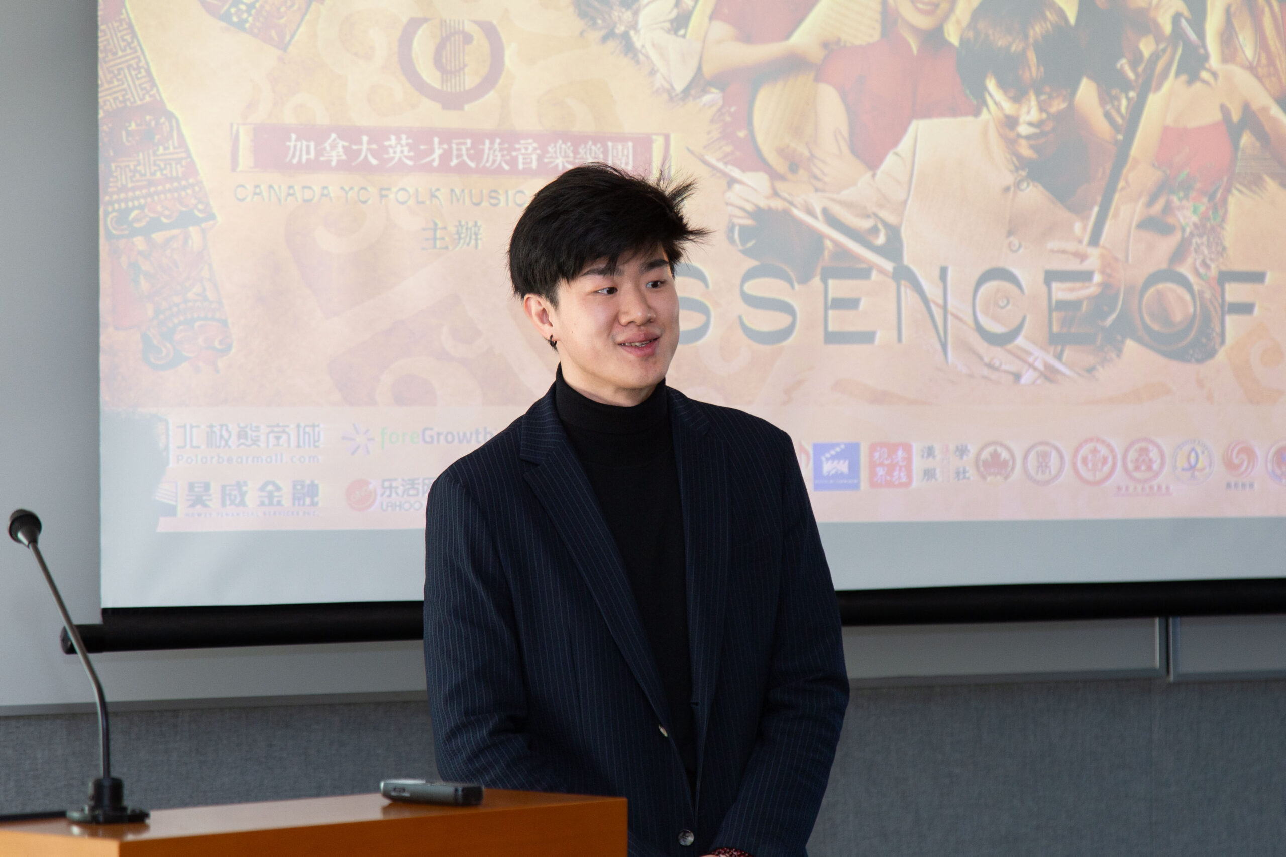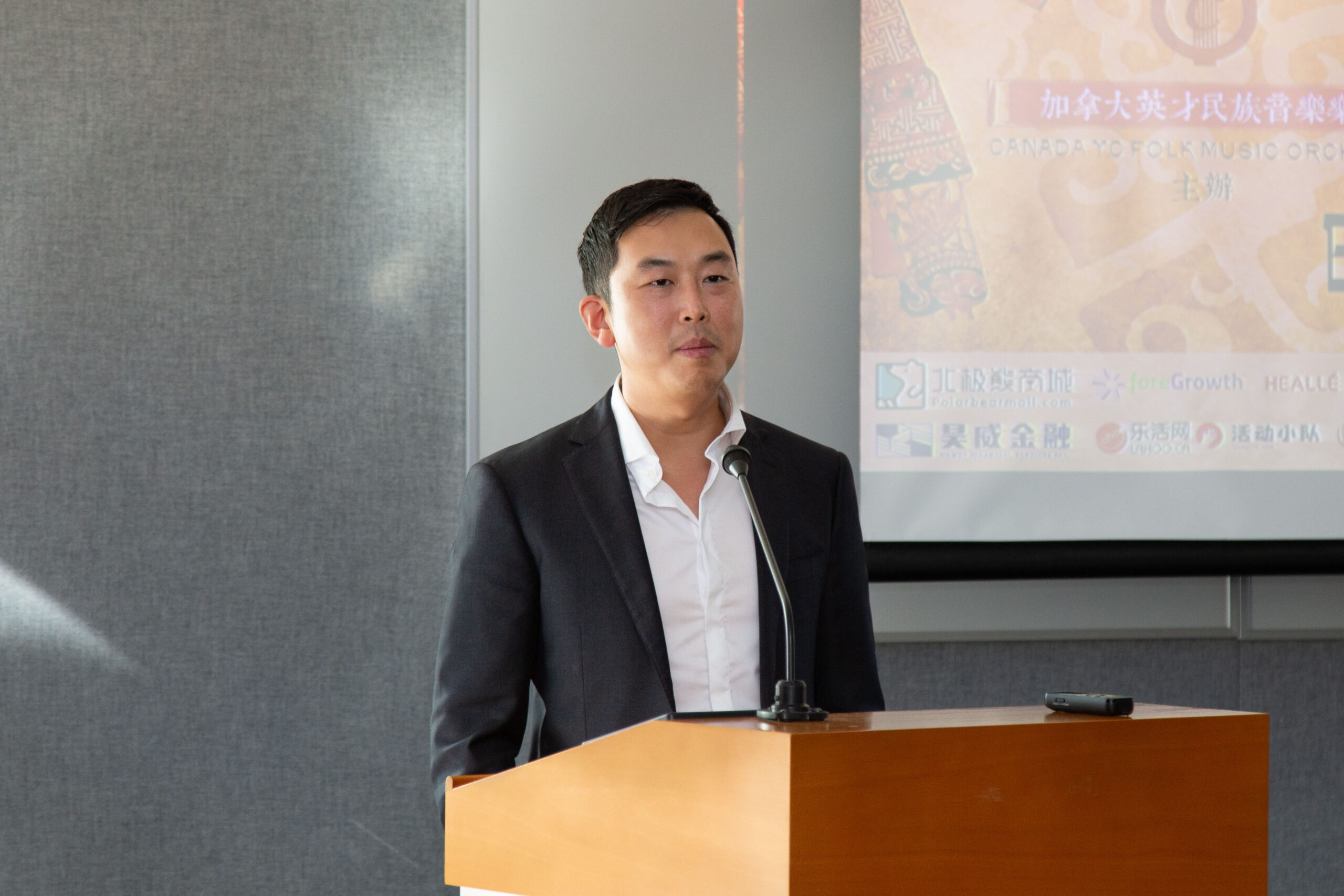 Max Guo 简短描述了ForeGrowth,其主要业务是投资北美商业地产,并管理了大约15亿的资产。他分享了自己在加拿大的成长经历,如何在温哥华成长的同事仍然维持对中国文化的热爱以及在杨老师的教导下学习二胡和古筝,并对两位老师的培养和支持表示感谢。