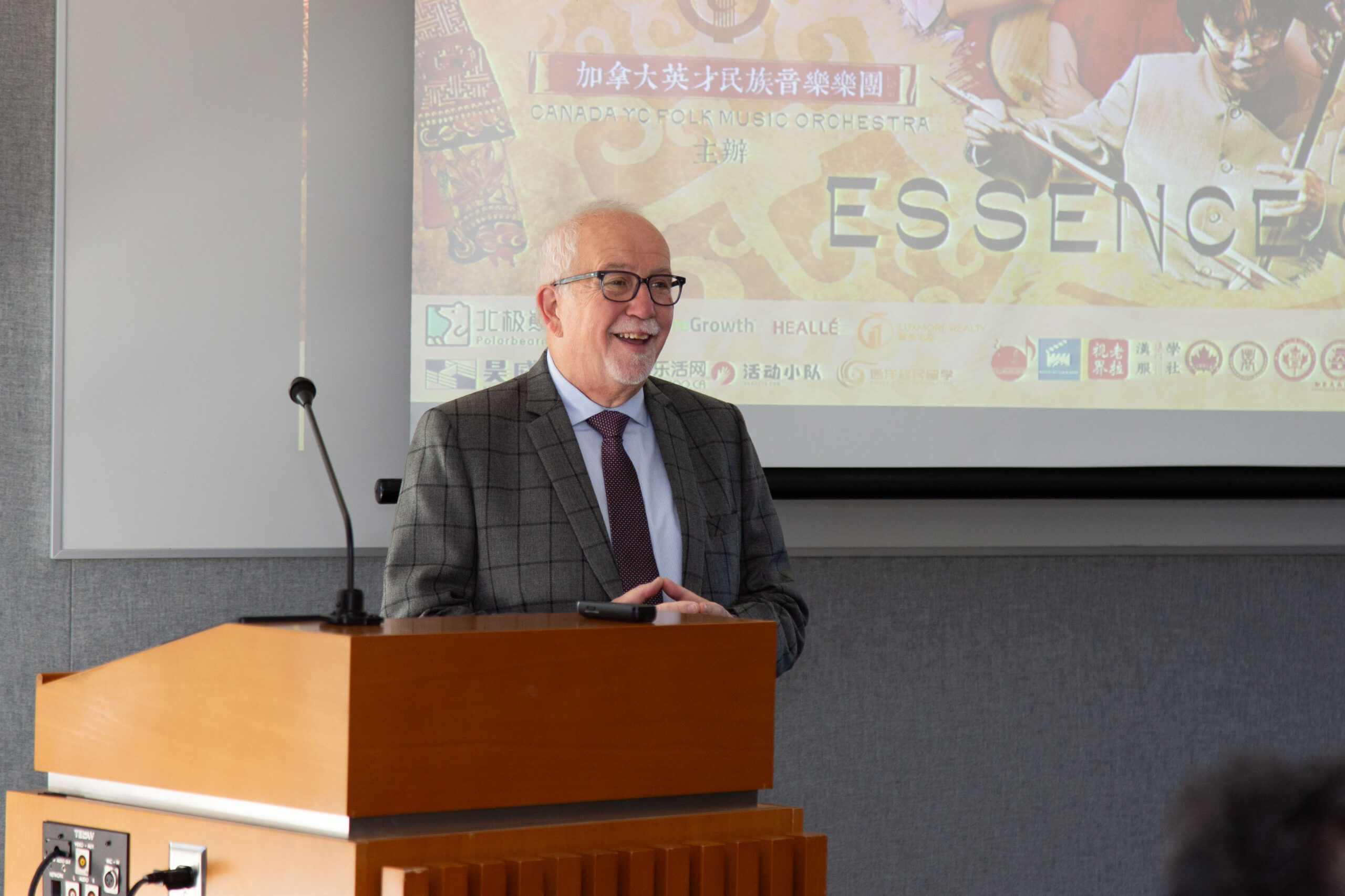 Dan Tidsbury 首先从职业层面上,强调了Vancouver Davis College的国际化宗旨和对各种文化的理解。从个人层面,他表示自己也是音乐爱好者,认为音乐是一种心灵的沟通方式。他对能够参与这次活动表示感谢,并希望音乐会取得成功。