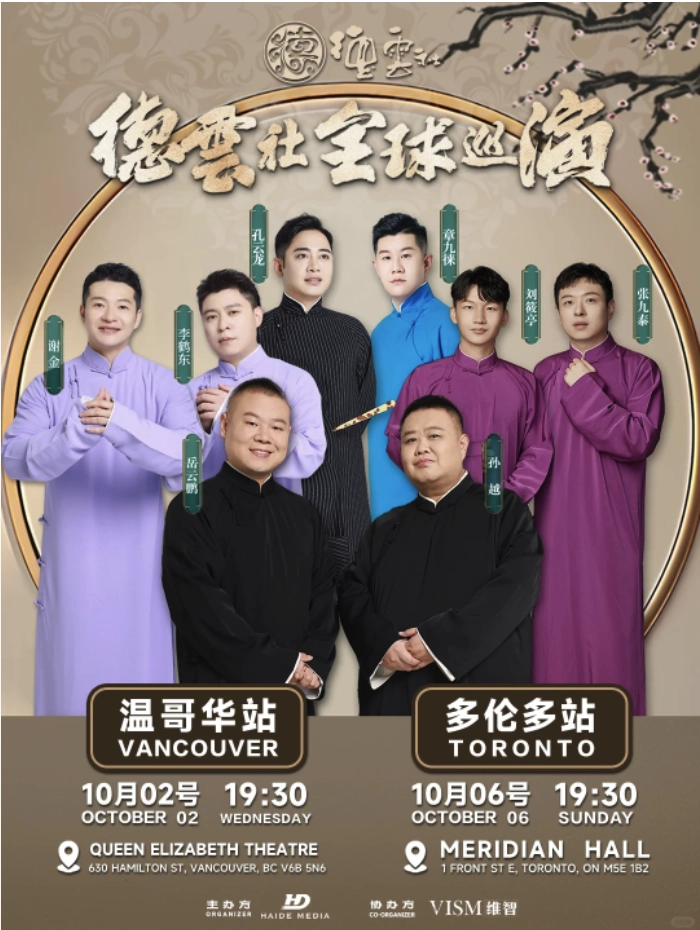 据悉,此次岳云鹏携德云社团队抵达温哥华,正式开启为期三周的北美巡演,温哥华站就在10月2号开演,估计喜欢的友友们已经抢好票准备观看这场精彩表演了吧!
