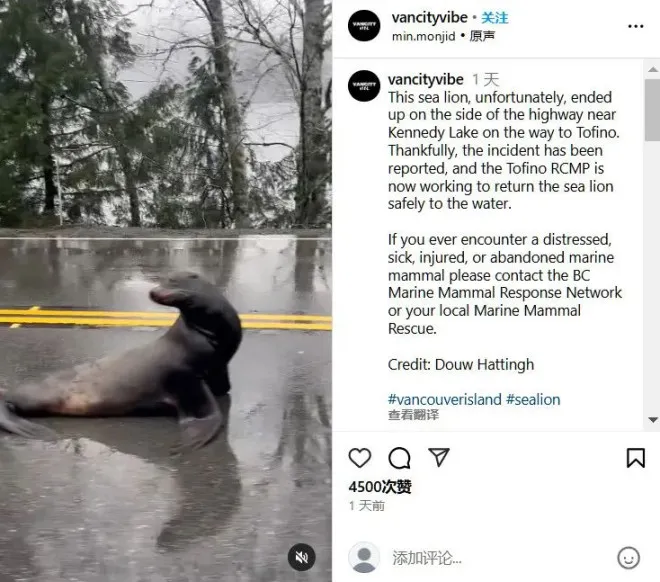 在前往托菲诺的路上,这头海狮安静地趴在高速中间,对于经过的车辆表现出了好奇,但并没有出现惊慌。