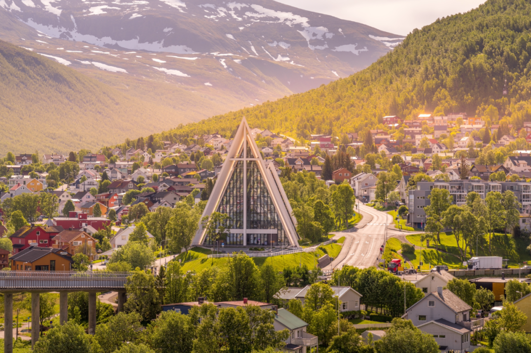 特罗姆瑟有着“极光之都”的美誉,而夏季,则被极昼笼罩,午夜的阳光将整个城市映照得金辉闪耀。城市本身也是建筑与自然的结合典范:北极大教堂(Arctic Cathedral)以冰川为灵感建成,是挪威现代主义建筑的代表。此外,这里拥有挪威最活跃的文化与科研中心之一,包括特罗姆瑟大学与极地研究机构,推动全球气候与北极生态研究的最前沿。