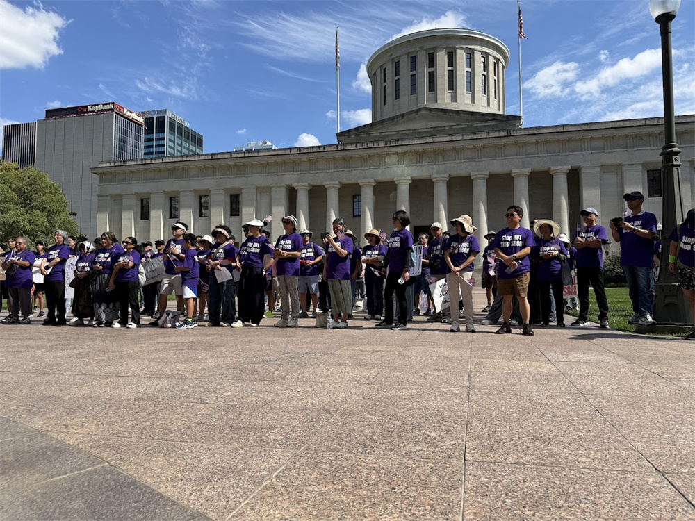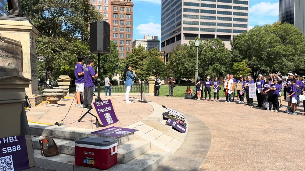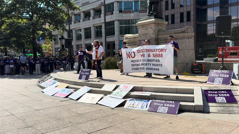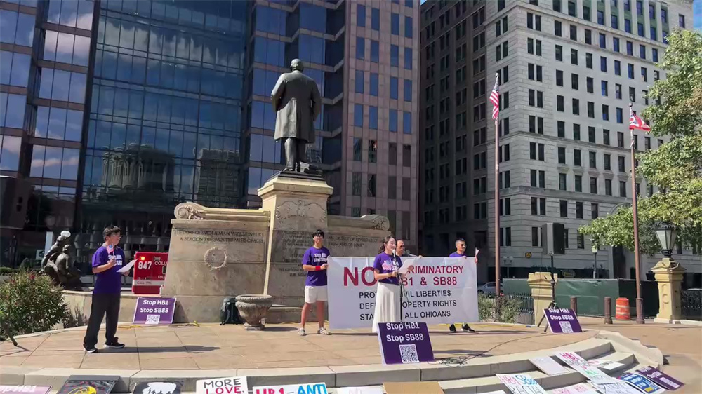 9月27日,来自俄亥俄各地的数百名民众齐聚州议会大厦,抗议州议会正在讨论的众议院一号法案(HB1)和参议院八十八号法案(SB88)。抗议者指出,这两项法案假借“国家安全”之名,实则歧视华裔及其他特定国家的移民,并敦促立法者立即阻止其通过。