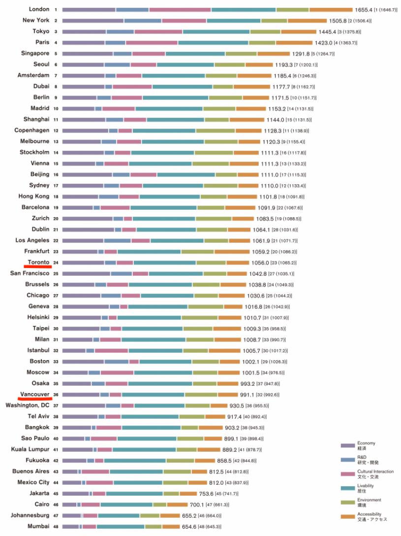 根据由国际学者编制的最新全球最具吸引力城市指数(Global Power City Index,GPCI)综合分析,温哥华与其他主要城市相比实力正在下降。从2015年的排名第20位跌至现在的第36名,十分令人震惊。同一榜单上的另一个加拿大城市多伦多名次也在下滑,从10年前的第16名,如今跌至第24位。