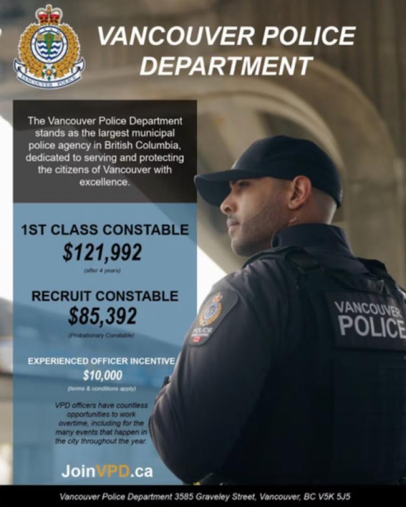 温哥华警察局的招募资料强调薪资优渥,其中提到“无数的加班机会,包括全年在市内发生的许多事件”。