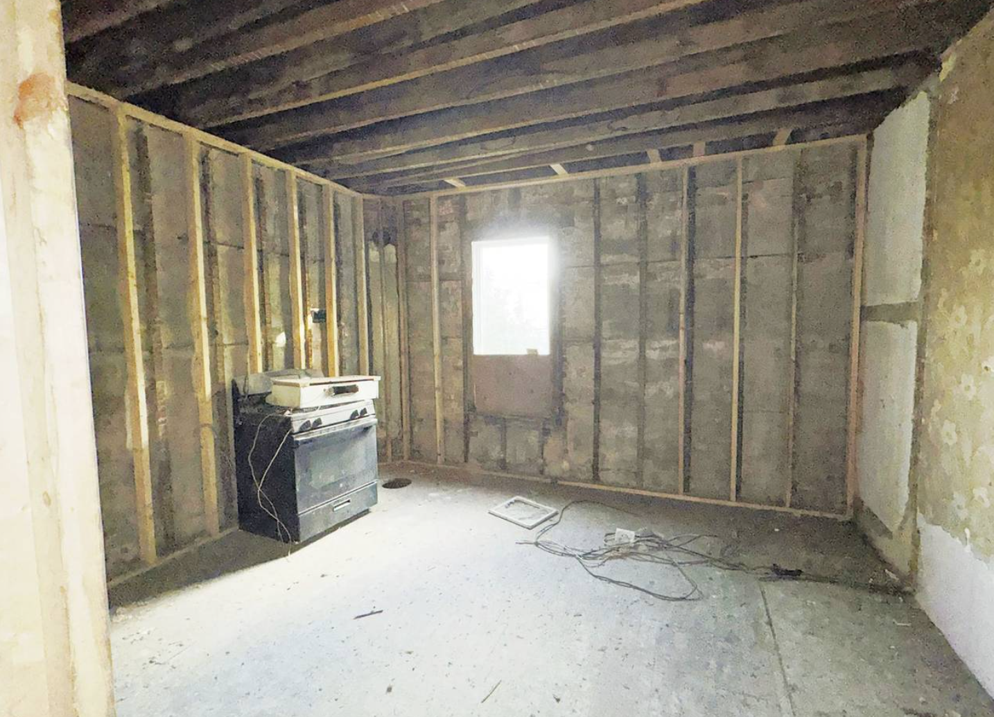 房子被拆得只剩下骨架,墙上涂满了涂鸦,窗户都被木板封了起来,内部空空荡荡,只有几个废弃的烤箱和一个行李箱……