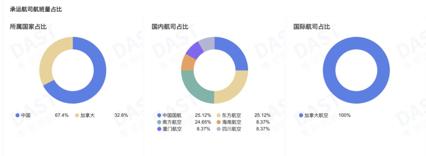目前执飞中加航线的内地航司主要有6家,分别是国航,东航,南航,厦航,川航和海航,疫情前曾飞加拿大的首都航空尚未恢复中加航线,而加拿大方面只有加拿大航空一家在飞。
