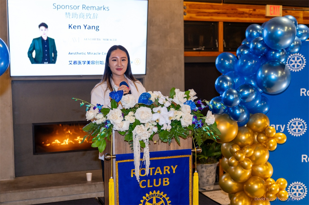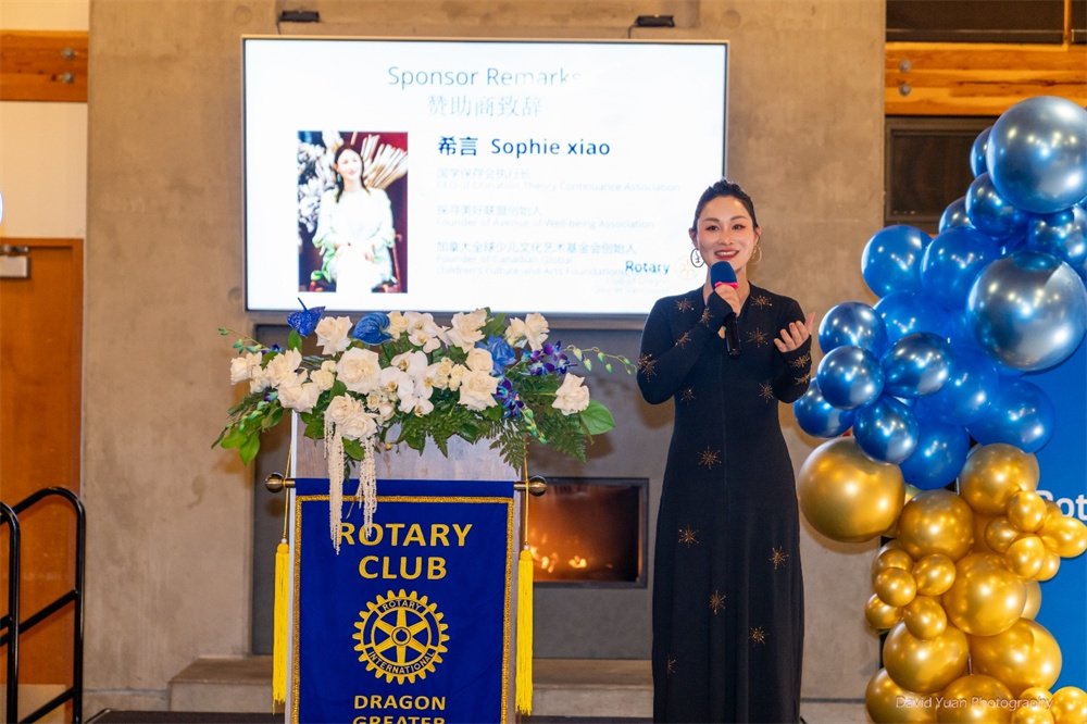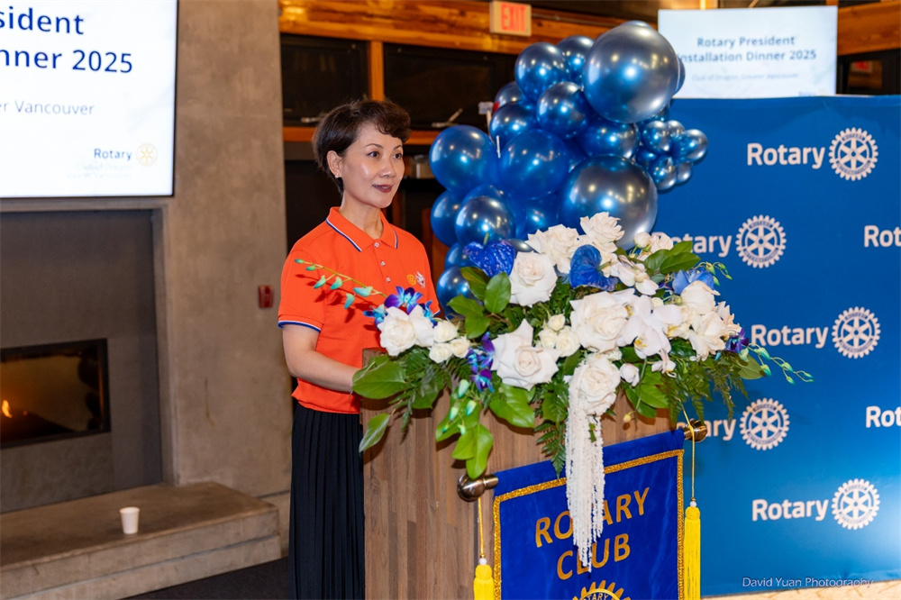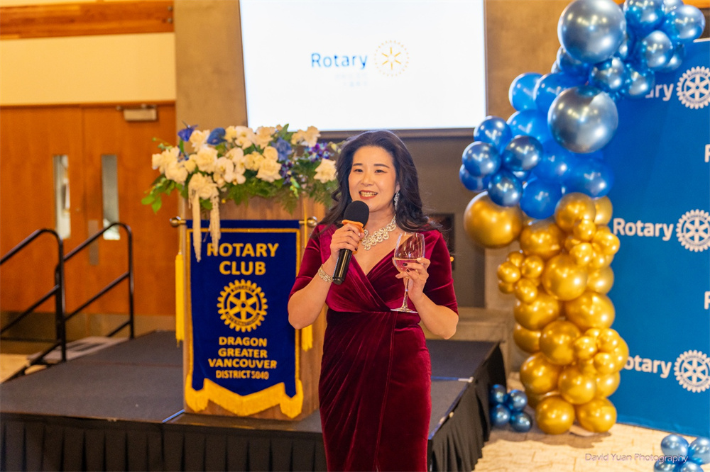 Tina Guo致辞寿险特别感谢创会会长 James Wang 先生,正是他的远见和努力,才有了今天 Dragon Club 的蓬勃发展。同时也向历届会长 Leaf、Kathrine、Angela 和 Alice 致以最诚挚的谢意。正是在他们的带领下,扶轮社在本那比市产生了深远而积极的影响。本那比市是一个充满活力、多元文化和绿色环保理念的城市,而扶轮社的各位会长和社友们始终与这座城市的特点紧密配合,积极支持本那比医院基金会等本地公益事业,为社区的繁荣与健康贡献了重要力量。
