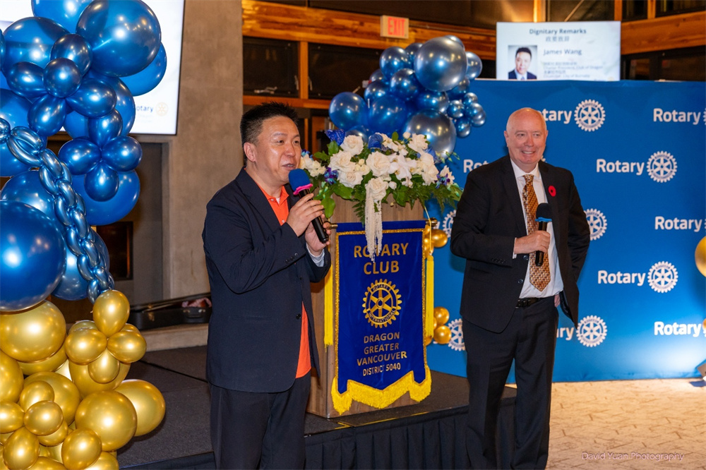 大温华人扶轮社龙社初始会长、本拿比市议员James Wang致辞