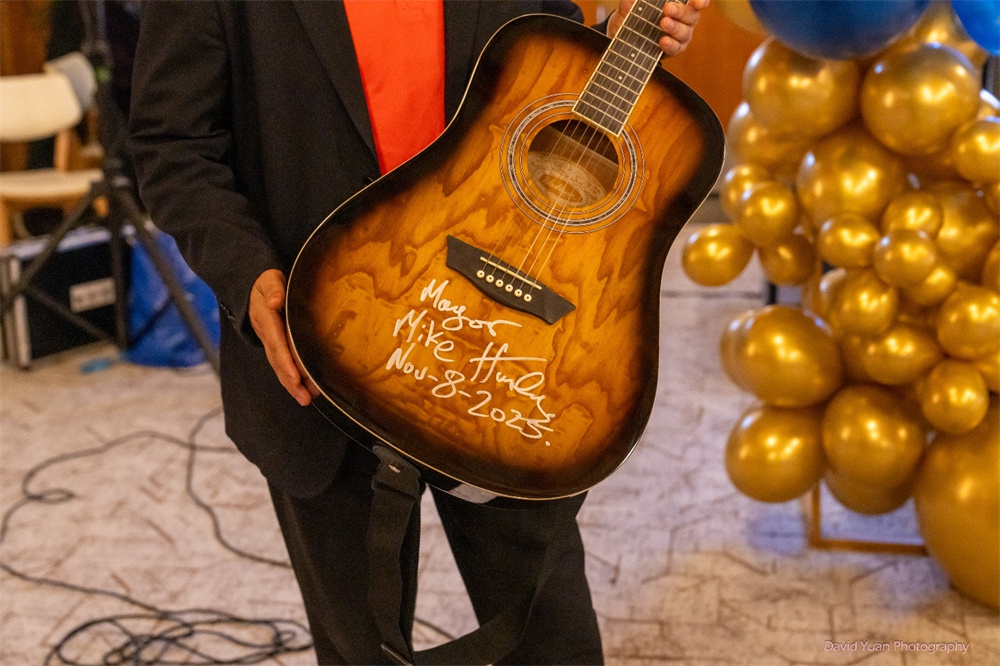 本拿比市市长Mike Hurley不但是多年的市长,也是一位优秀的音乐人,他现场签名的吉他被探寻美好联盟创始人希言以$1100高价拍得