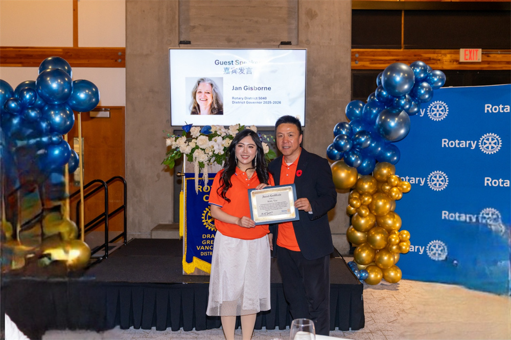 Tina Guo会长介绍了新成员,Ding, Dianna;Guo, Winnie;Wang, Eva;Yin, Eileen;Chui,Kennith;Yao,Kitty 被授予大温华人扶轮社龙社会员身份,让在场的嘉宾们对扶轮社的未来发展充满期待