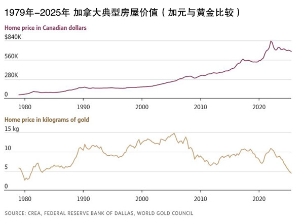 1981年,加拿大普通住宅价值约4.5千克黄金;如今其价值仍与此相当。若以白银衡量,加拿大普通住宅价值约375千克白银,与1986年持平。