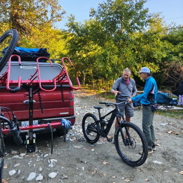Chris出生于大温地区,后来因为长年在硐矿场担任领班&机械维护、在Williams Lake安家置产,退休后也成为长期RV房车族;夏季卑诗省、冬季南下墨西哥。这次从家中出发,沿着20号公路西行450公里、经过挑战的The Hill险坡 (路段仅43公里,但是从1600米海拔、猛降至海平面的碎石险路),住扎在Bailey Bridge Campsites、方便钓鱼。夫妇俩、随行的舅子,都是钓鱼爱好者。因此,不在溪边垂钓、就是骑着电辅单车四处遨游。