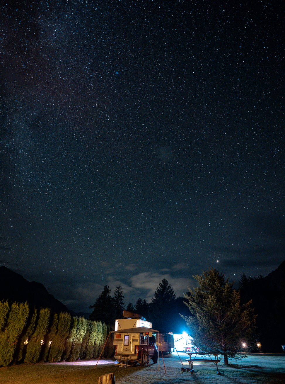 夜晚,在 Bella Coola 的 Rip Rap 营地,你能在篝火旁抬头看到横跨天空的完整银河拱桥;