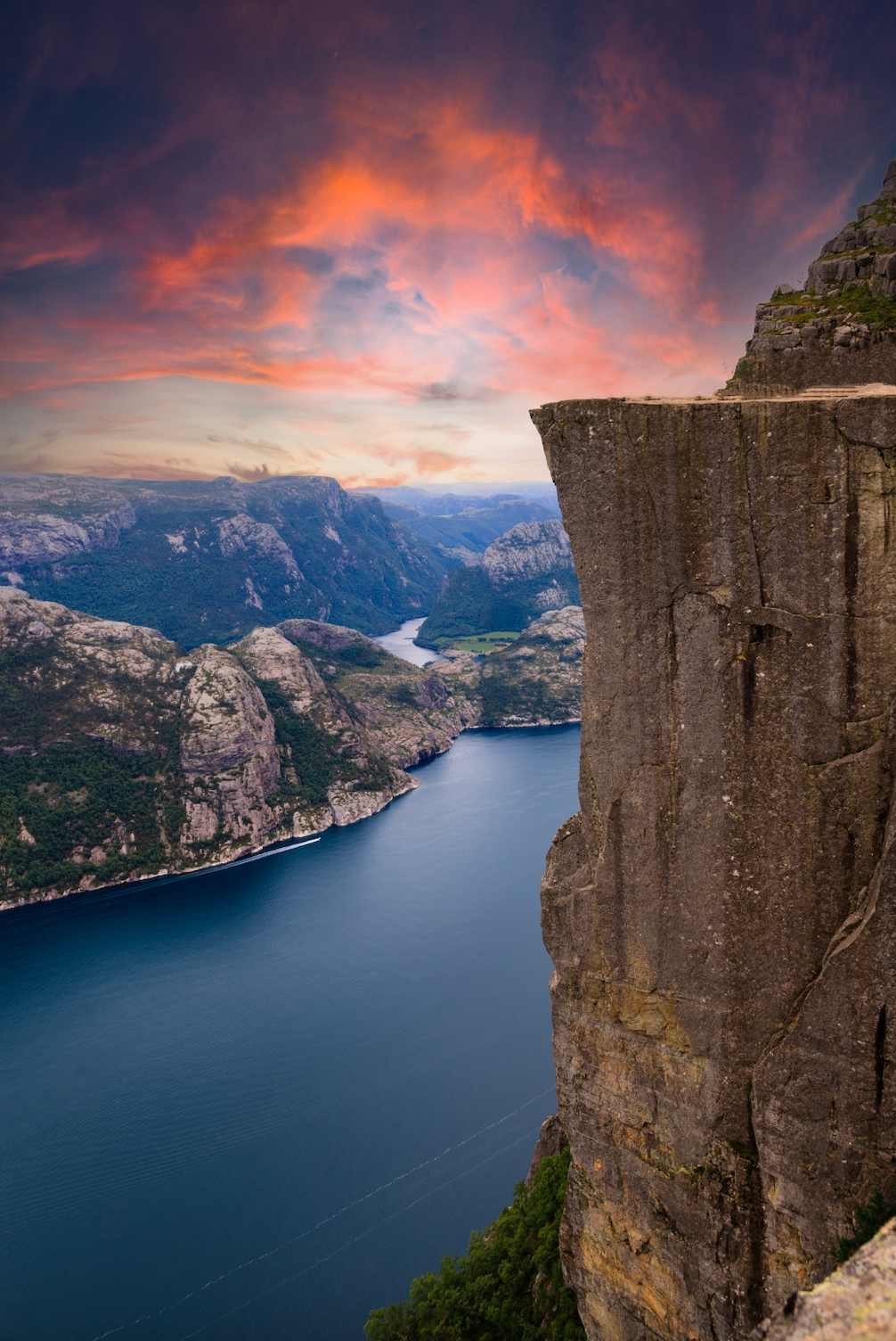 挪威峡湾是冰川与海洋的旷世杰作。联合国教科文组织将峡湾列为世界遗产,《国家地理》更称其为”未受破坏的旅游目的地之首”。当你乘船驶入松恩峡湾,便置身于地质史诗的现场——高悬的瀑布从悬谷飞泻而下,水底的岩坎引导着洋流的舞蹈。这蜿蜒的碧水长廊,不仅是冰与海塑造的奇迹,更是挪威冷峻外表下,那深邃而坚韧的生命力。