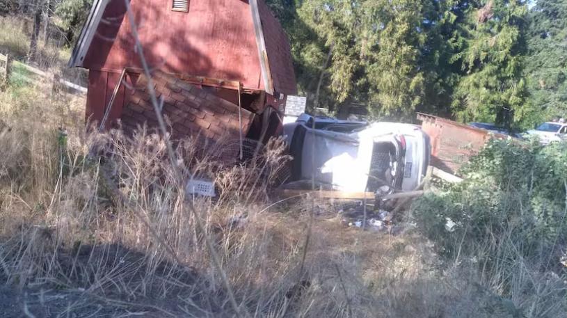 而上周二,一名卑诗商用车辆安全执法组(Commercial Vehicle and Safety Enforcement,CVSE)的警员在追逐一辆皮卡车时,似乎转弯速度太快。“那辆CVSE的警车最终越过公路,冲进了我们的院子,”伯顿说。
