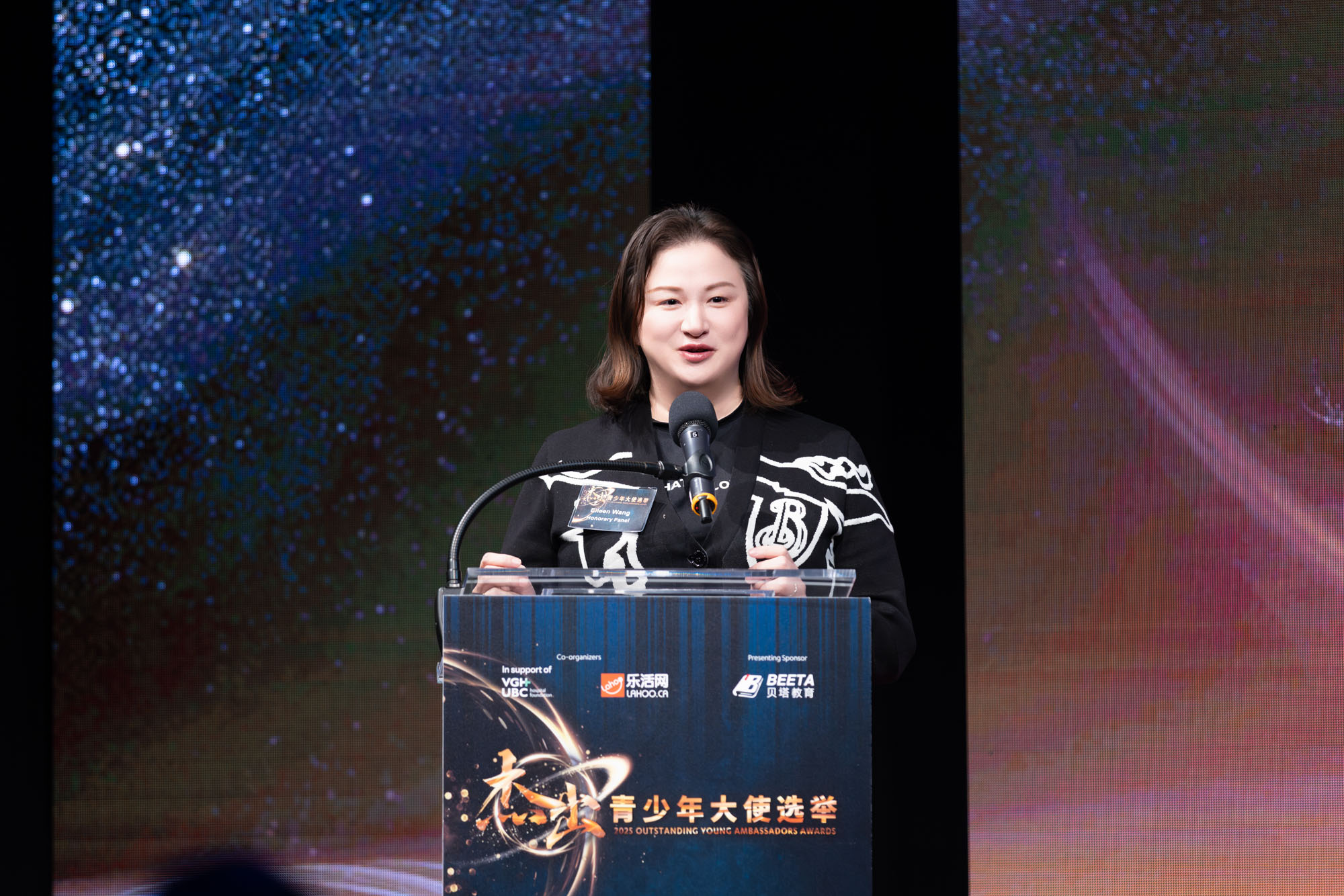 赛事的冠名赞助商贝塔教育创办人Elieen Wang表示,回忆自己从中国求学时期一路担任学生领袖的经历,并表示看到现场众多优秀青年而深受触动。她鼓励年轻人持续投入学校与社区的领导与服务,因为这些经验将为未来发展带来深远影响。贝塔教育自2009年成立以来,致力于为K-12至研究生阶段学生提供成长规划、课程学习与国际教育交流,她表示长期参与VGH青少年大使选举,是基于企业的社会责任与支持青年发展的使命。
