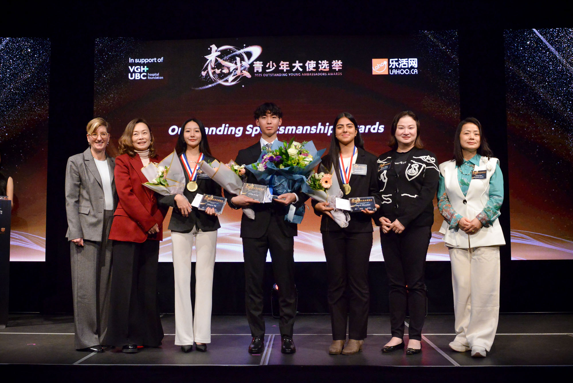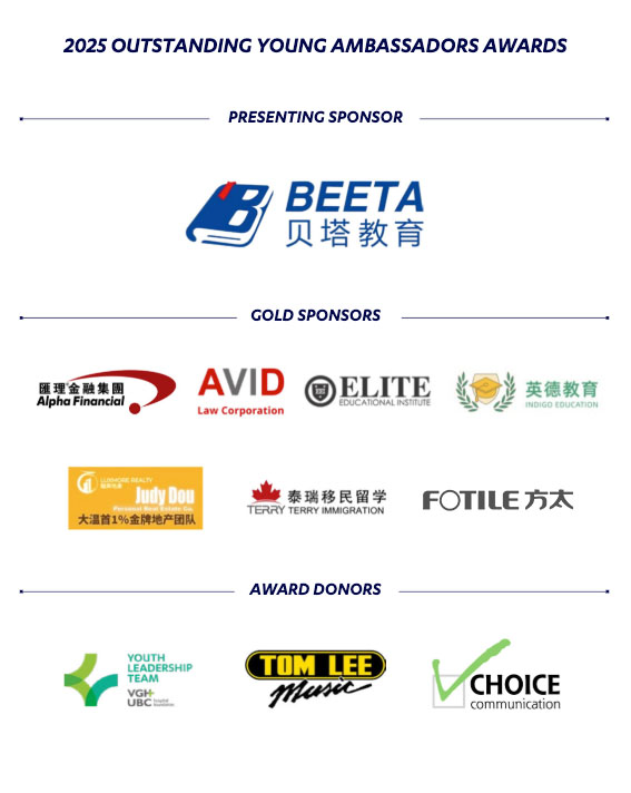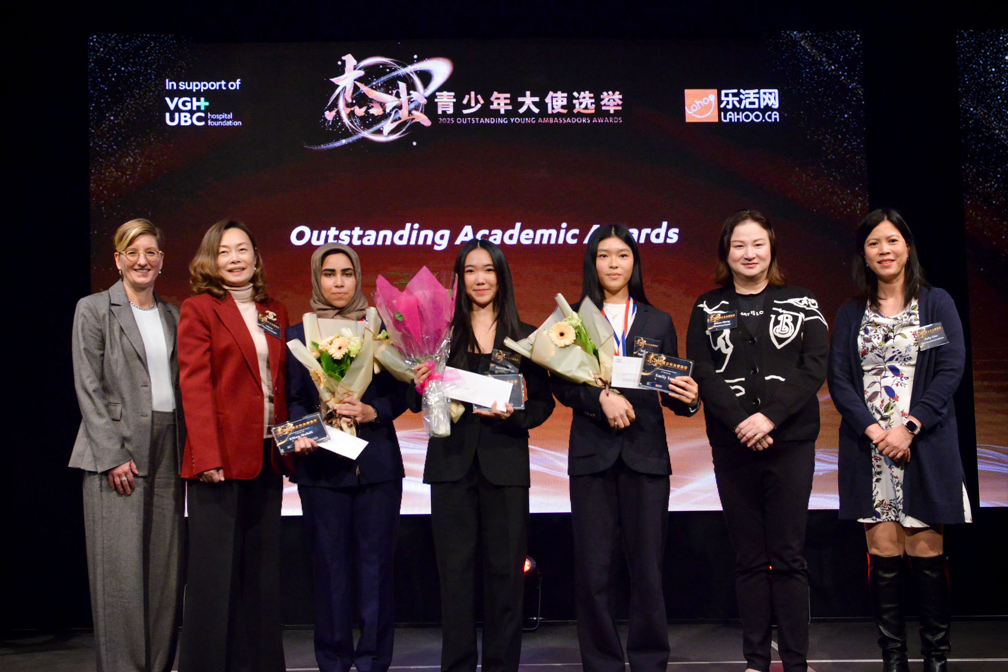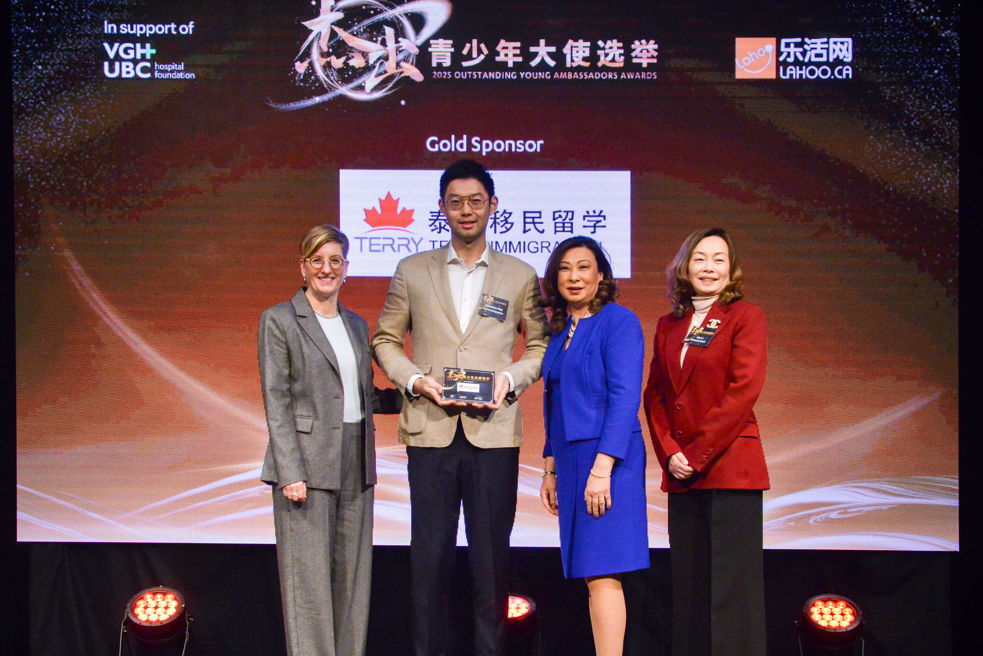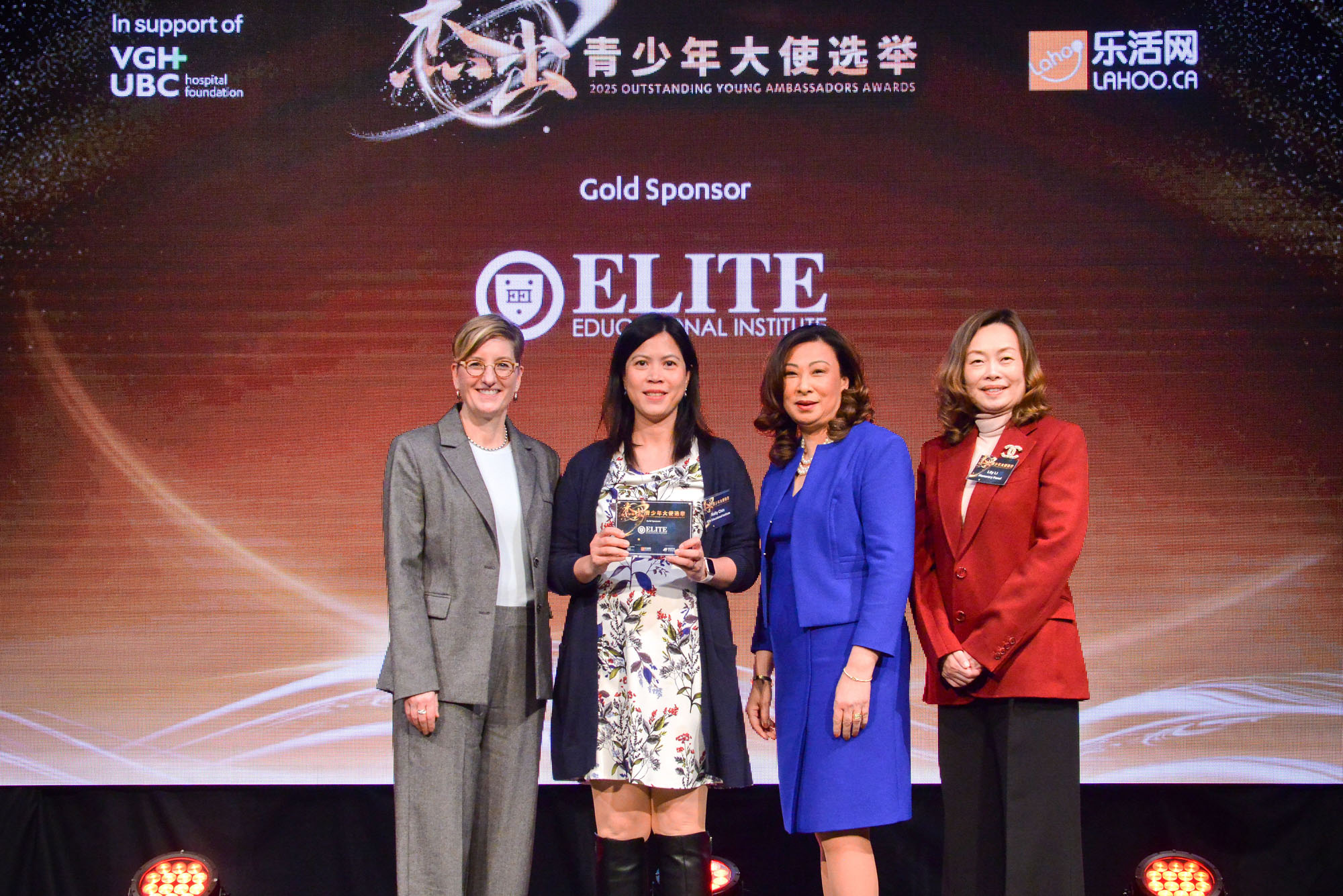 2025年杰出青少年大使学术组得奖者:Chloe Wu(冠军),Elina Mahdi(亚军),Emily Yan(季军),赛事赞助商Elite Education高级副总裁Kelly Chin为获奖者颁奖。Elite教育自2003年在温哥华扎根,专注为四至十二年级学生提供教育支持,协助他们追求卓越。他表示,教育的核心不仅是学习,更是培养能为社会贡献力量的人。借由VGH等平台,学生得以运用所学回馈社区,展现自身价值,并祝愿所有获奖者持续成长、发挥影响力。