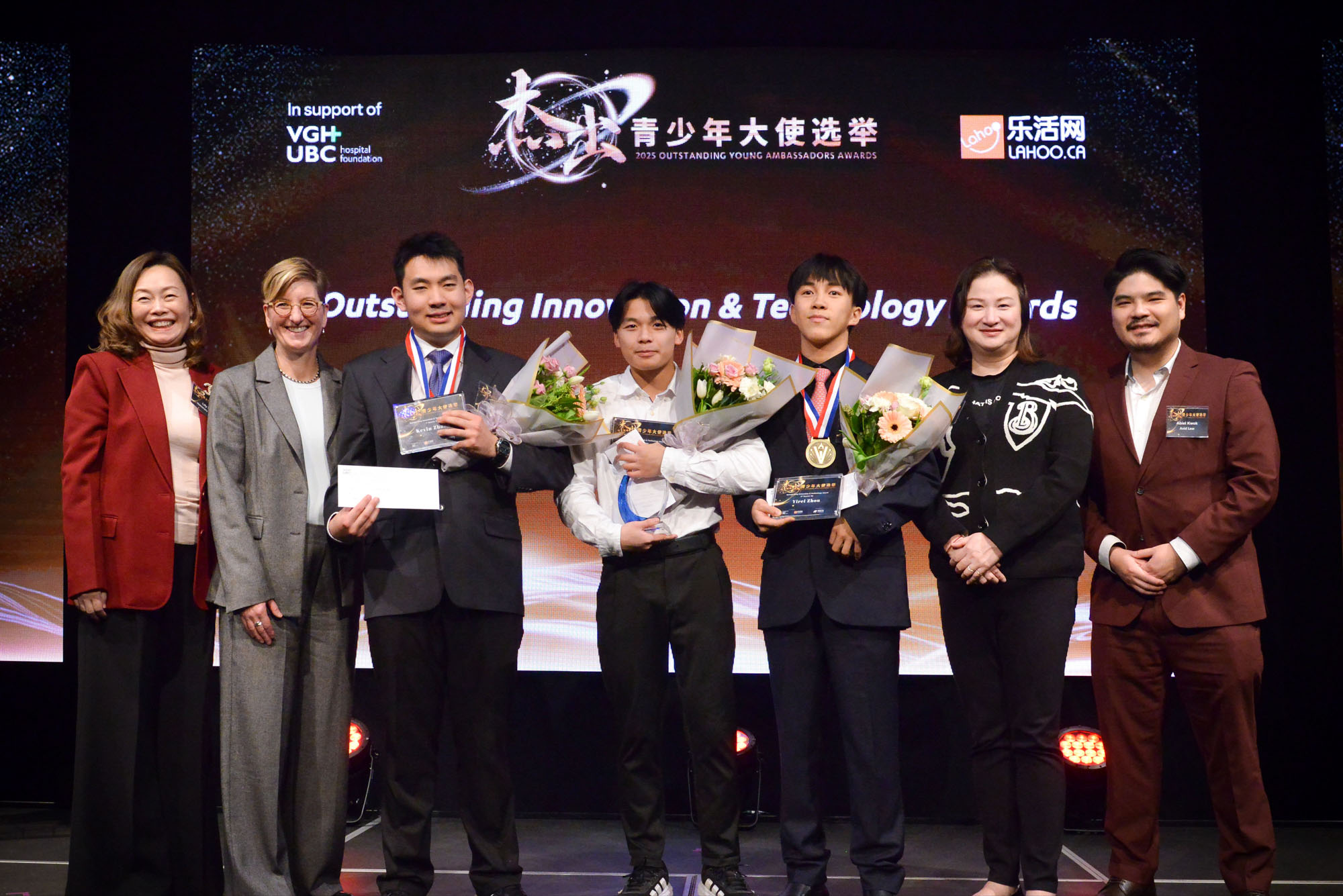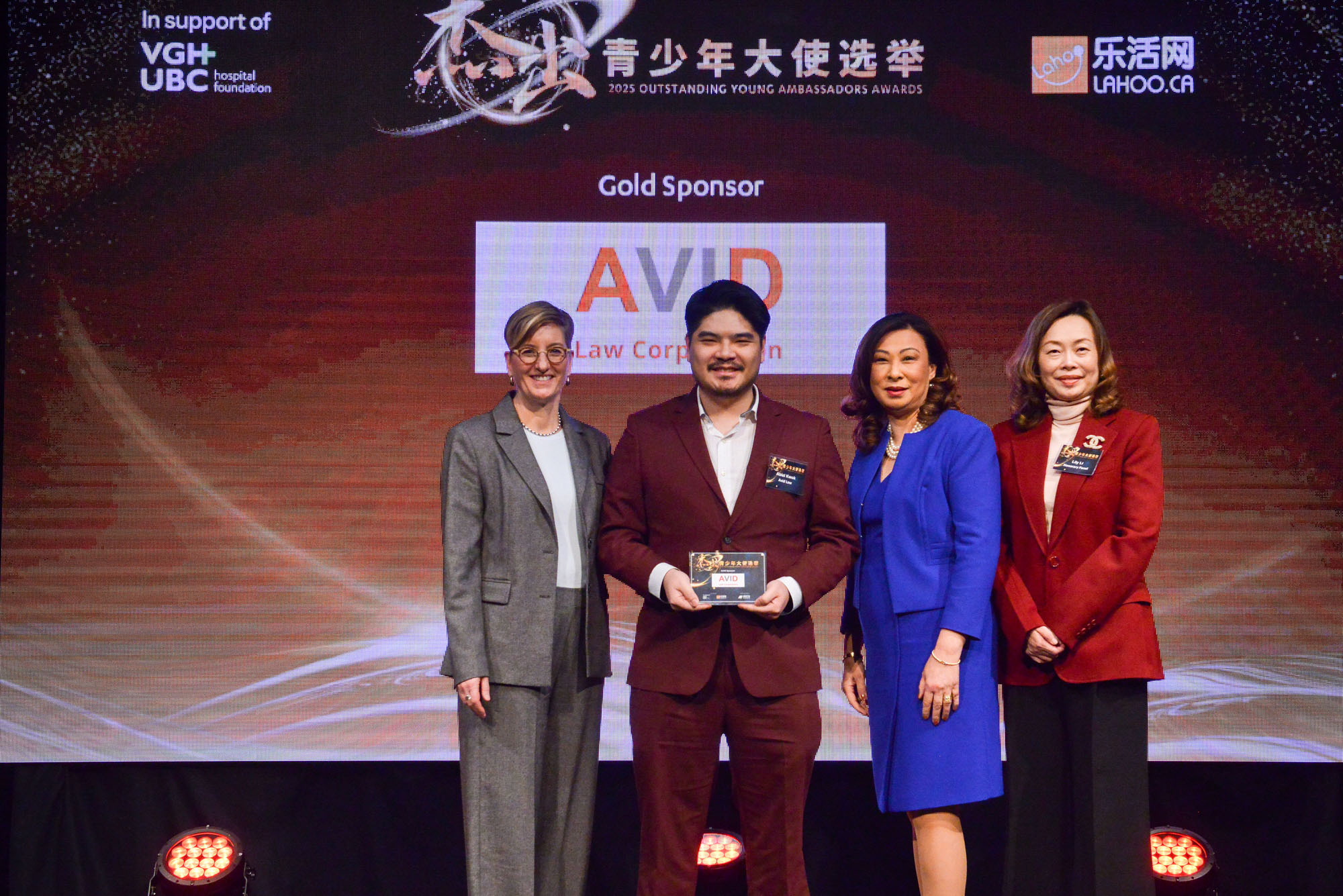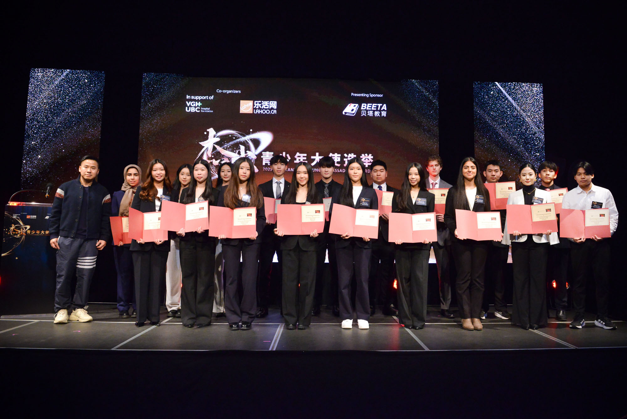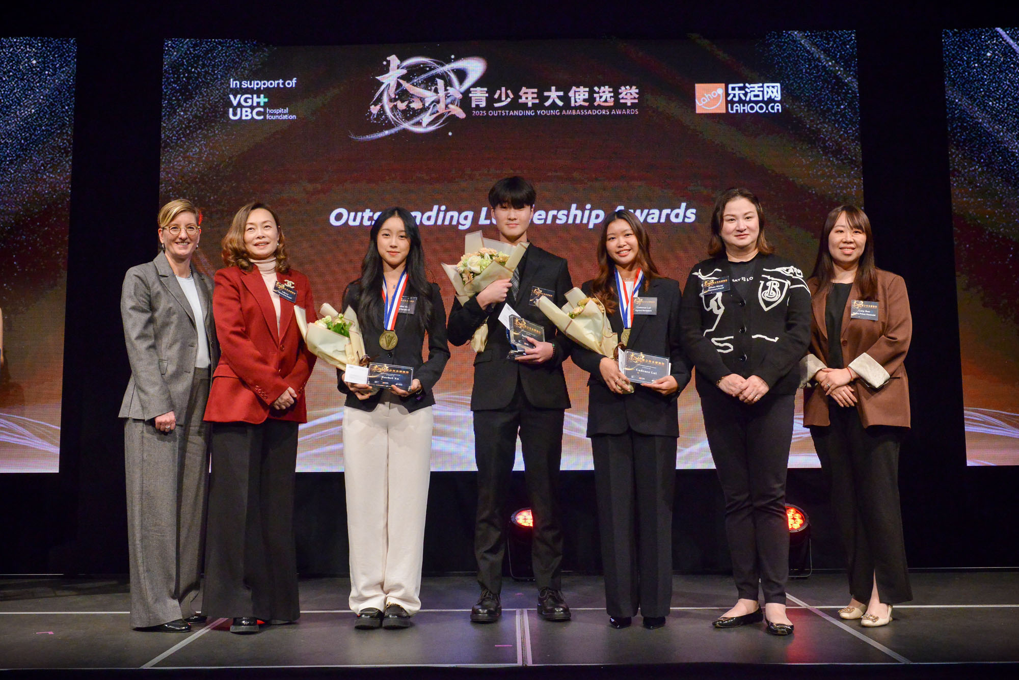 2025年杰出青少年大使学术组得奖者:Chloe Wu(冠军),Elina Mahdi(亚军),Emily Yan(季军),赛事赞助商Elite Education高级副总裁Kelly Chin为获奖者颁奖。Elite教育自2003年在温哥华扎根,专注为四至十二年级学生提供教育支持,协助他们追求卓越。他表示,教育的核心不仅是学习,更是培养能为社会贡献力量的人。借由VGH等平台,学生得以运用所学回馈社区,展现自身价值,并祝愿所有获奖者持续成长、发挥影响力。
