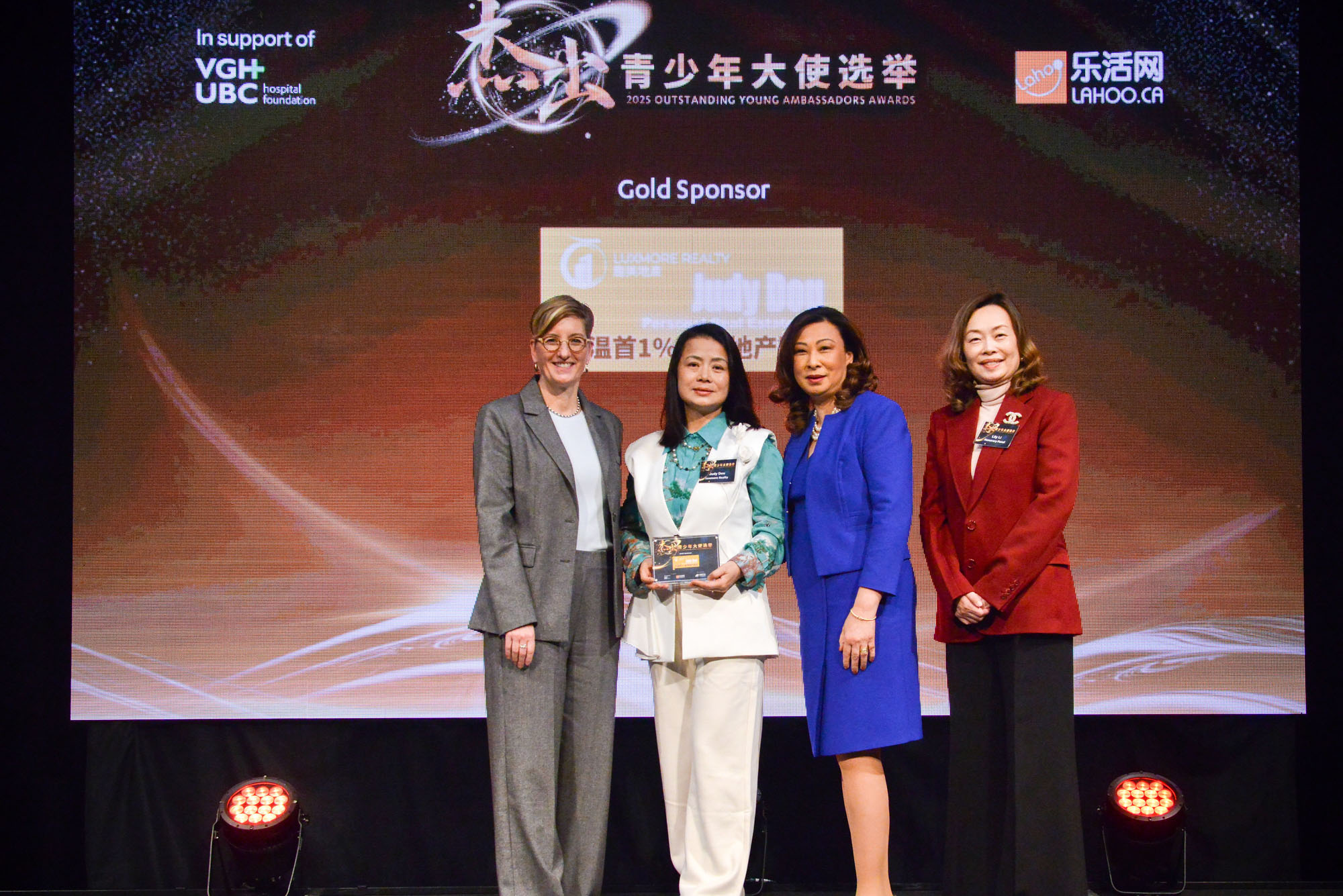 2025年杰出青少年大使体育组得奖者:Alvin Kong(冠军),Choyee Ng(亚军),Amrit Bhandal(季军),赛事赞助商Luxmore Realty(龙美地产)联合创始人Judy Dou女士为获奖青少年颁奖。龙美地产专注于温哥华的住宅、商业、物业管理、土地开发领域,致力于为华人安家。她向2025年青少年大使选举的所有入选者与获奖者致以诚挚祝贺,期待他们在今天的舞台上闪耀发光。她鼓励青年在未来继续以勇气、担当与热忱投入社区与社会,用实际行动为世界带来积极改变。