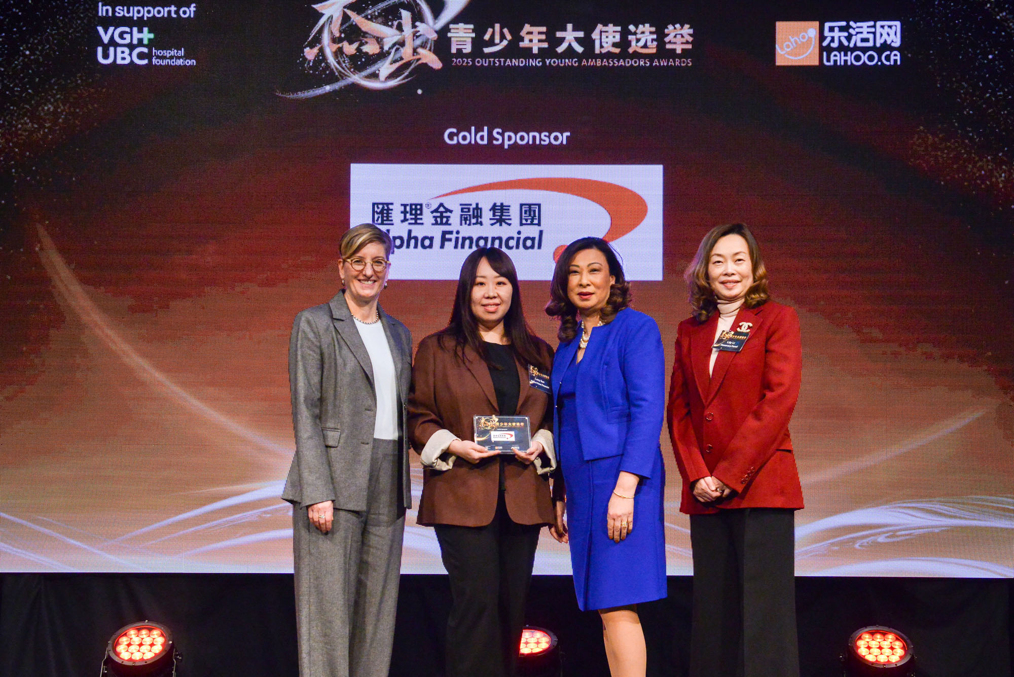 2025年杰出青少年大使领导才能组得奖者:Jacky Tang(冠军),Rachel Xu(亚军),Cadence Lui(季军),赛事赞助商AlphaPrime Financial(汇理金融集团)总裁助理Lucy Sun为获奖者颁奖。汇理金融集团多年来在温哥华专注于保险理财代理服务,拥有与多家顶级保险公司的最优级别合作协议,为保险顾问们提供专业高效、以市场为导向的培训。她表示,公司很高兴支持这样的活动,让年轻人们为社区做出更多贡献,也为他们未来的发展积累更多经验。希望获奖者们未来在各行各业都可以充分发挥自己的领导能力,为社会带来更多正面影响。