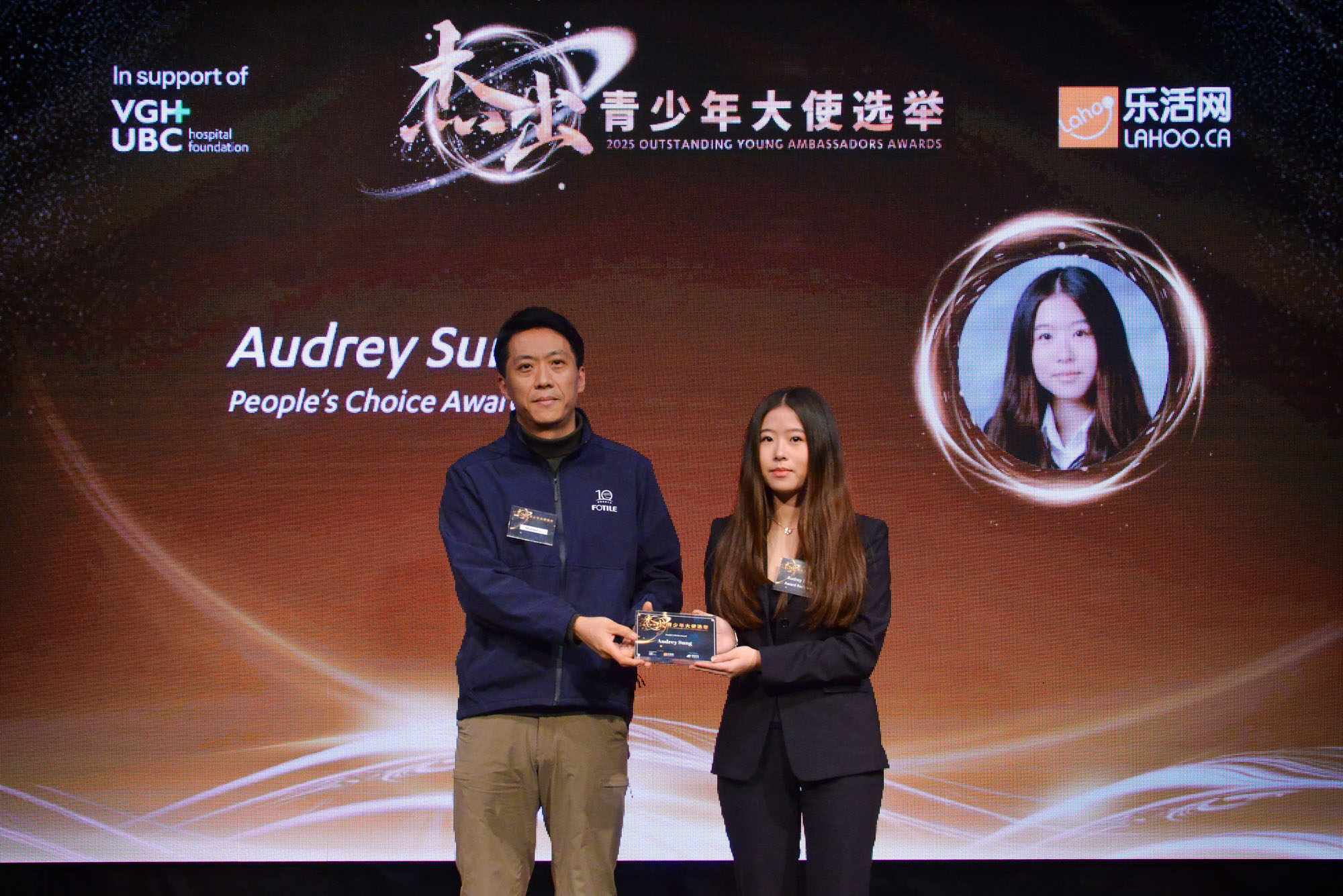 本届特别设立的最具人气奖得主是Audrey Sung,由方太公司的市场负责人Michael Li负责颁奖。Michael Li先生说,方太在加拿大已经开展了十余年的业务,并于2024年在大温开设分公司。作为一个服务华人的初建企业,方太很高兴贡献为社会一份力量,为青少年的成长做出支持。