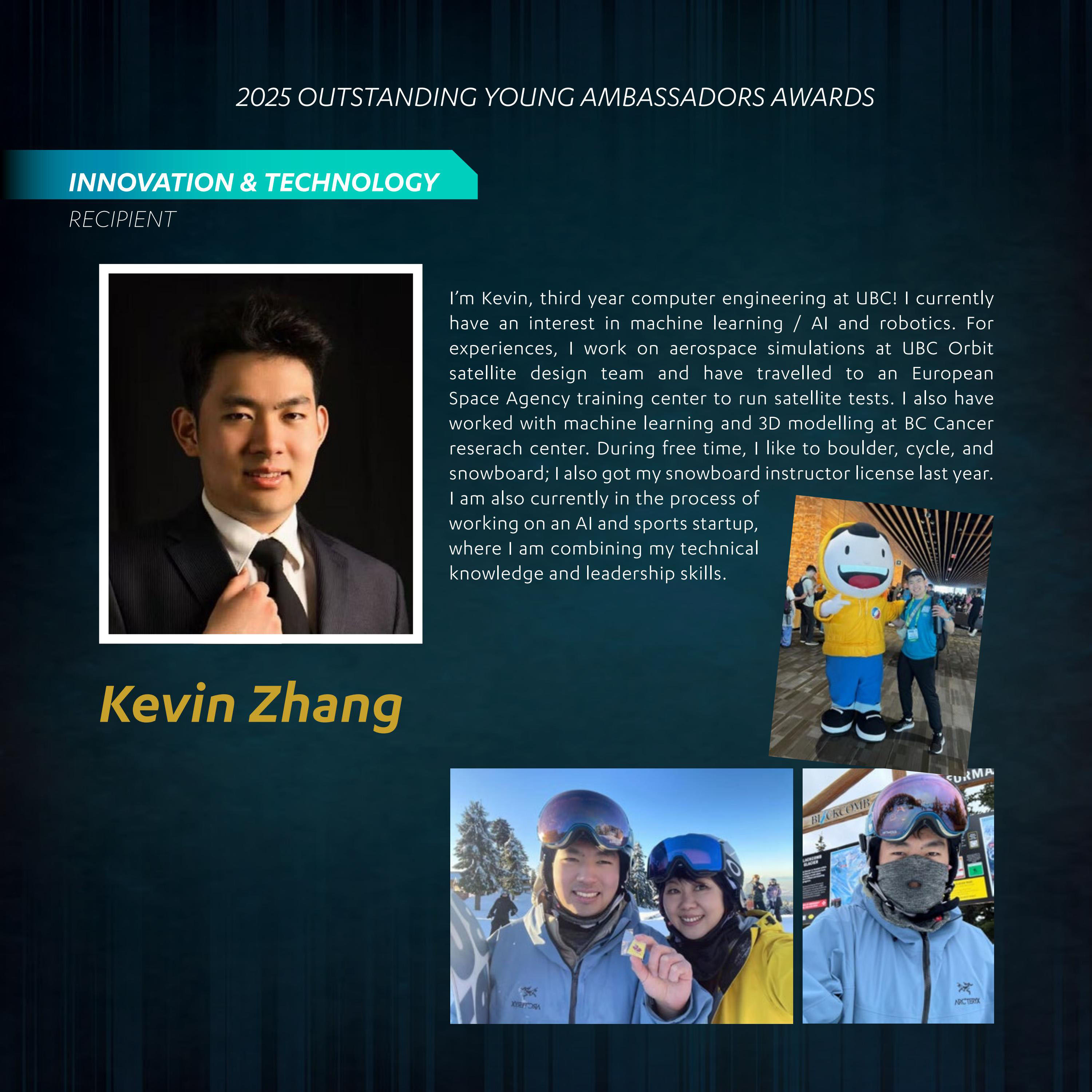 同样展现出行动力的,还有就读于英属哥伦比亚大学工程学的Kevin Zhang。他目前主修计算机工程,日常学习之外投身于校园航天团队,参与卫星模拟与测试工作,并曾前往欧洲的航天培训机构进行实操项目。他在癌症研究机构参与过与数据和模型相关的研究,逐步明确了自己对科技应用的方向。生活里,他保持着充沛的精力,攀岩、骑行、滑雪是他调节节奏的方式。去年取得滑雪教练资格,也让他在技术之外找到另一种表达自我的途径。目前,他正着手筹建一个结合科技与运动理念的项目,希望把自己的训练、管理与技术经验凝聚成更具影响力的成果。