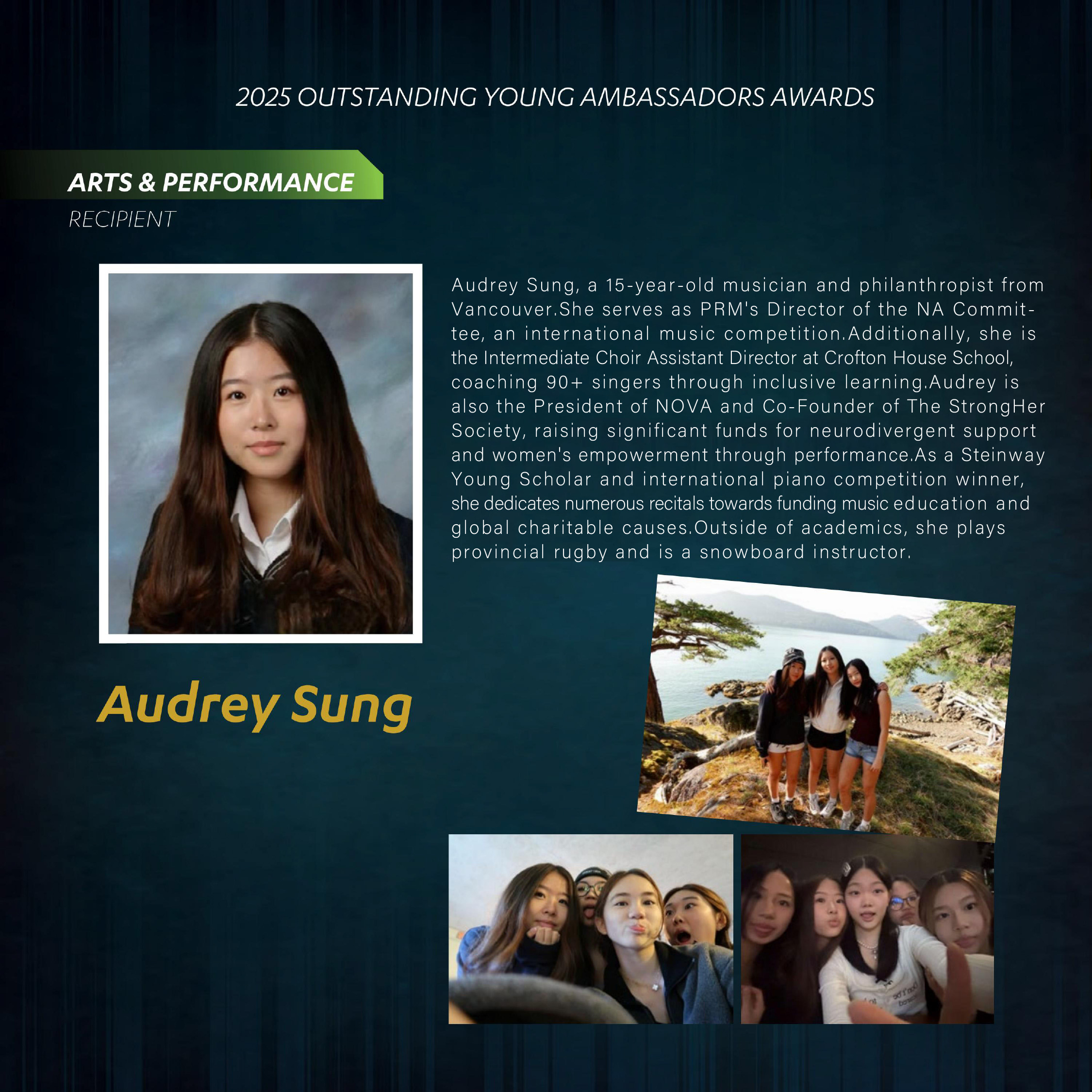 作为施坦威青年艺术家( Young Steinway Artist),她将无数钢琴独奏会的收益用于资助音乐教育及全球慈善事业。除了学术与音乐,她还活跃于省级橄榄球运动,并担任教练,展现出全方位的领导力和社会责任感。Audrey用行动证明,艺术不仅是表达自我的方式,更可以成为推动社会进步的重要力量。