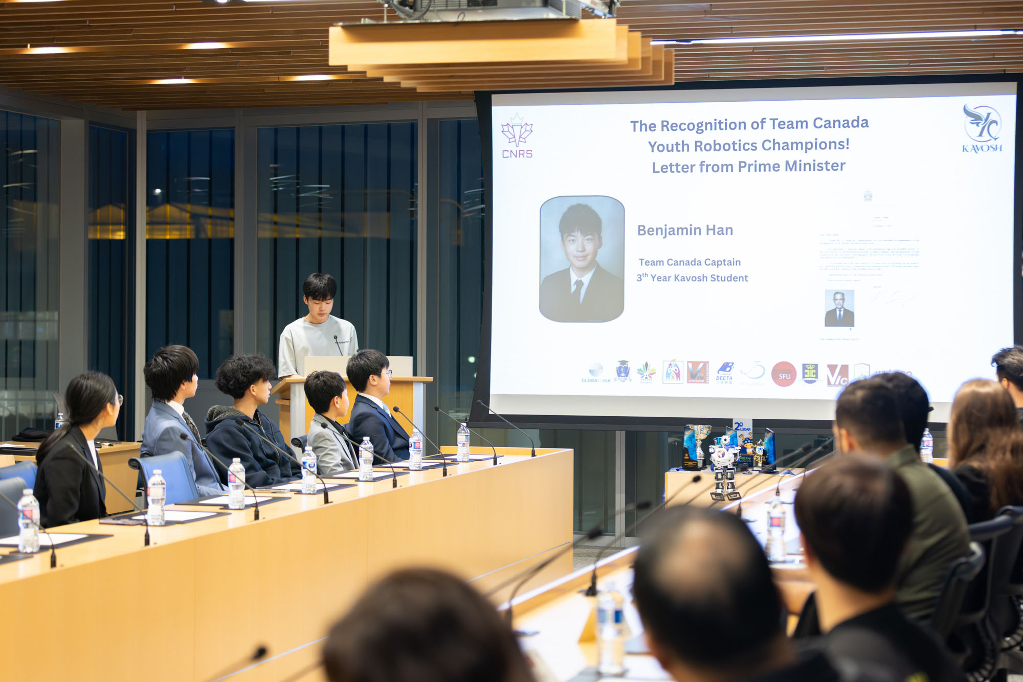 Team Canada队长、Kavosh学生Benjamin Han代表宣读了加拿大联邦总理致Team Canada Youth的贺信,对学生在2025 FIRA RoboWorld Cup(韩国)中的出色表现表示祝贺,并勉励他们持续以科技创新回馈社会。