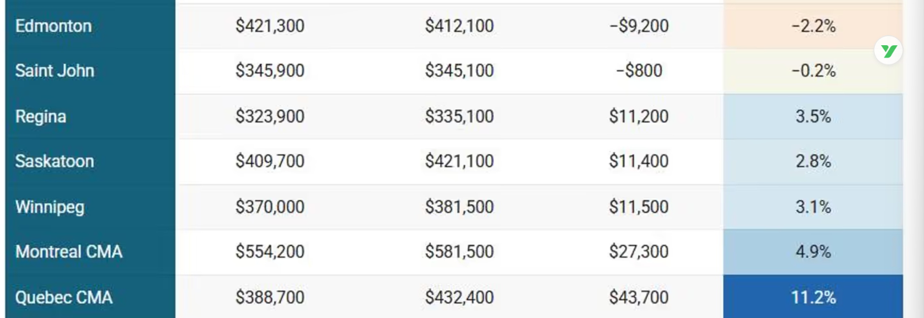 该报告关注的加拿大16个主要房地产市场中,有10个市场的基准房价下跌,5个城市明显上涨。魁北克大都会区(CMA)是个例外,自1月份以来房价上涨11.24%,达到432,400加元,上涨了43,700加元。蒙特利尔的涨幅位居第二,10月份购房者的平均支出比年初增加了27,300加元。温尼伯、萨斯卡通和里贾纳的房价小幅上涨,涨幅均低于11,500加元。