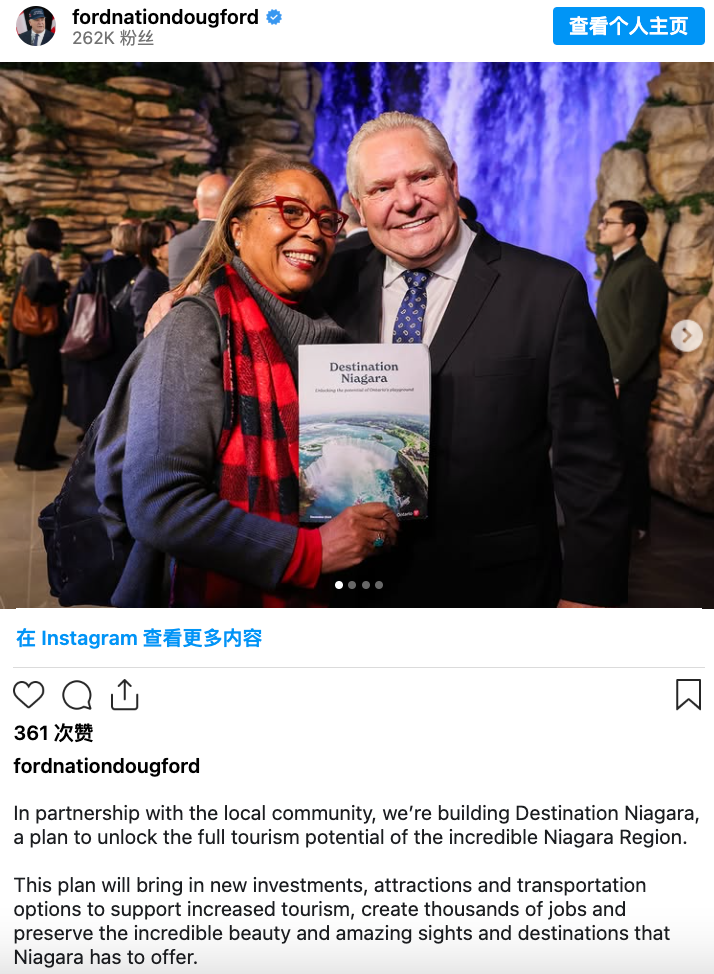 Doug Ford 表示,“这项旅游发展战略将释放尼亚加拉地区的全部潜力,为劳动者提供支持,也为来自安省乃至全球的游客和家庭创造全新的体验机会。”
