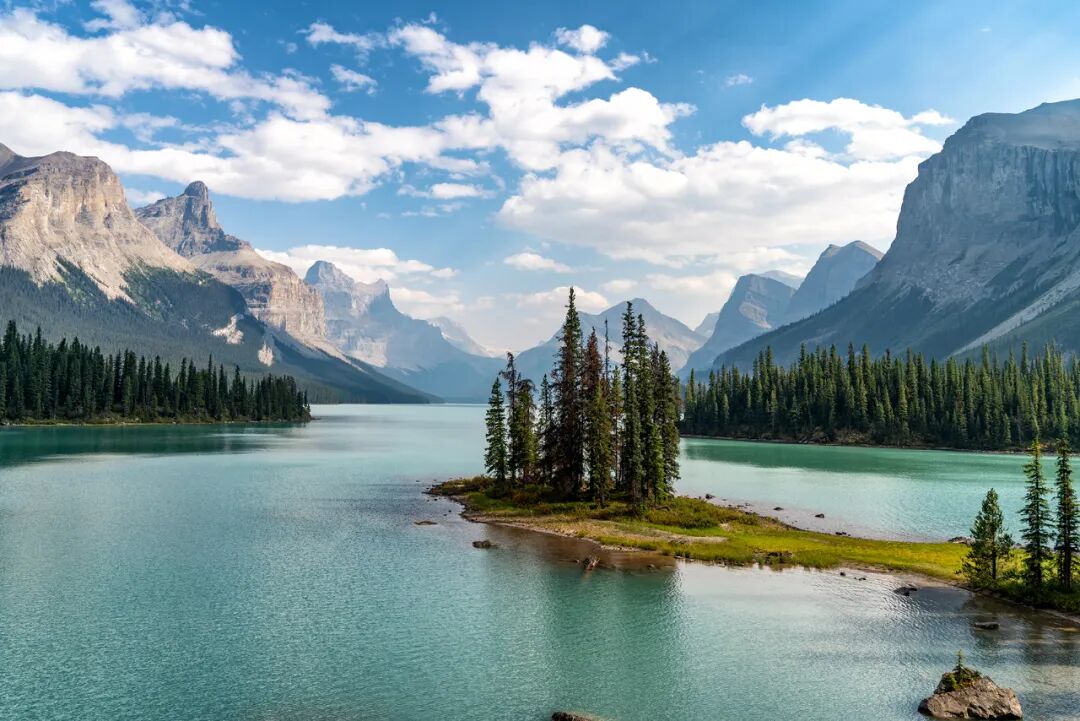 而真正让贾斯伯在摄影圈、旅行圈封神的,是马林湖与精灵岛(Maligne Lake & Spirit Island)。这里的湖水颜色、山体层次与倒影,被多次评为落基山最具代表性的自然景观之一。与路易斯湖、梦莲湖相比,它的名气稍逊,但画面感完全不输,游客却少得多。