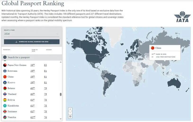 指数由伦敦全球公民与居留顾问公司Henley & Partners编制,参考了国际航空运输协会(IATA)的独家数据。报告指出,护照通行力不仅体现个人出行便利,更反映一个国家的外交实力与国际公信力。