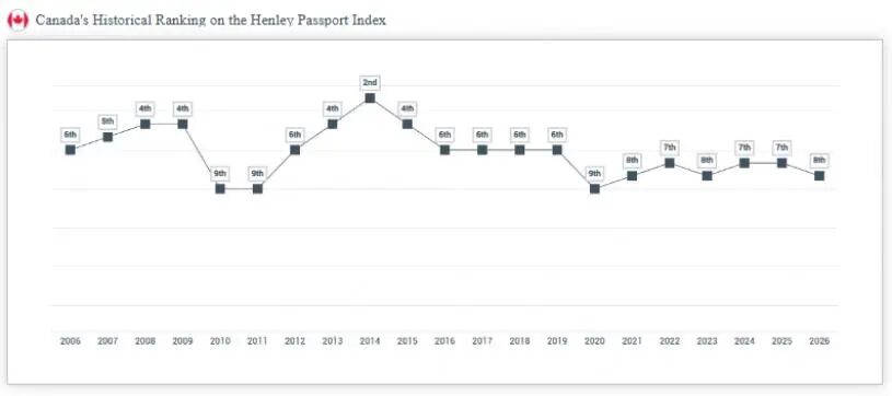 亨利护照指数(Henley Passport Index)周二(13日)发布了2026年最新版全球护照通行力排行榜,新加坡连续多年稳坐榜首,加拿大则名列第八。