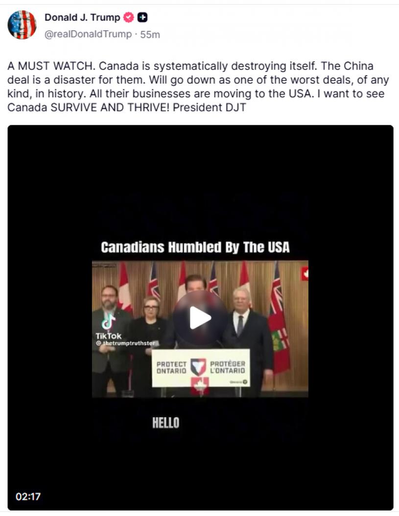 美国总统特朗普周日(25日)再度针对加拿大发言,表示“加拿大正系统性地自我毁灭”,并形容加拿大与中国的贸易协议为“灾难”,更指中国将彻底接管加拿大。