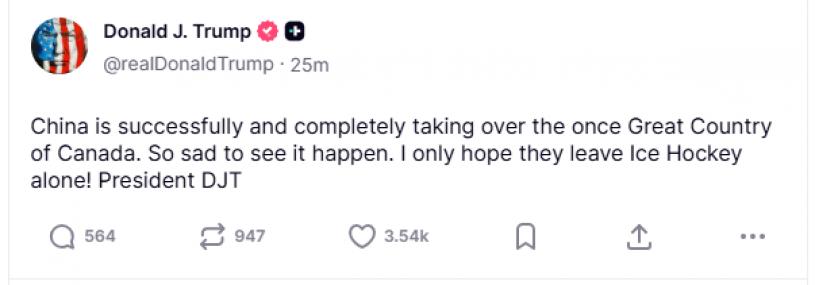 在随后的帖子中,他补充说,中国“正在成功且彻底接管曾经伟大的加拿大”,他“看到这一切非常难过”。“我只希望他们别动冰球!”特朗普写道。
