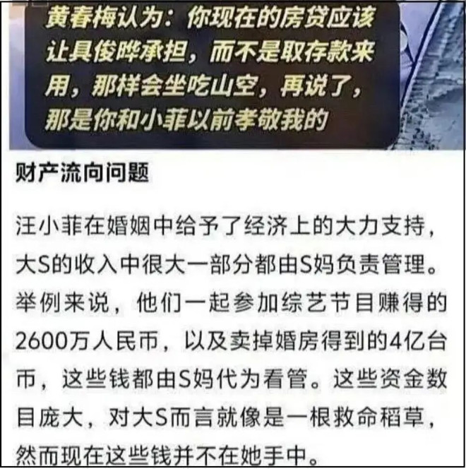同样是台媒报道,大S生前把积蓄都放在了S妈手里,和具俊晔再婚之后,大S经济状况越来越差,试图从亲妈手里把钱拿回来,被S妈断然拒绝。