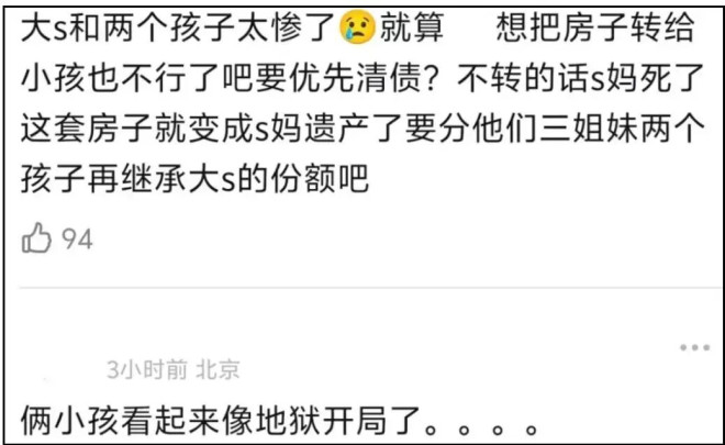 所以大S子女未来要面对的烂摊子,包括但不限于,为亲妈留下的、自己不住的豪宅还贷、和自己亲生姥姥争遗产、找回妈妈留下的珠宝等贵重物品…