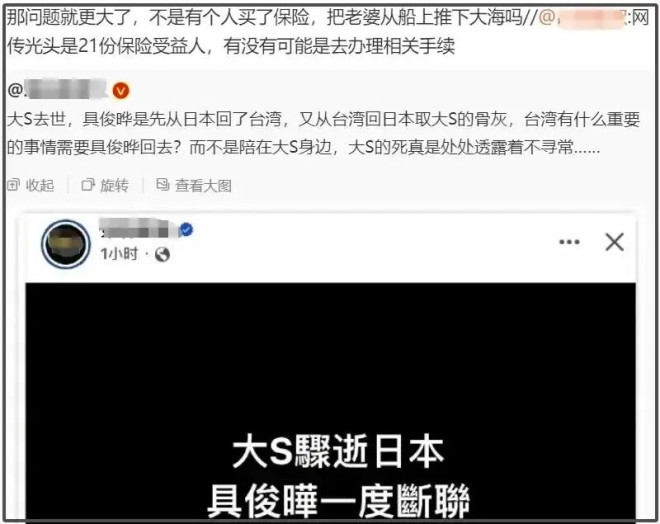 还记得大S死讯曝光之后不久,台媒就曝出具俊晔一度失联,还有消息称他去处理了二十多份保险。