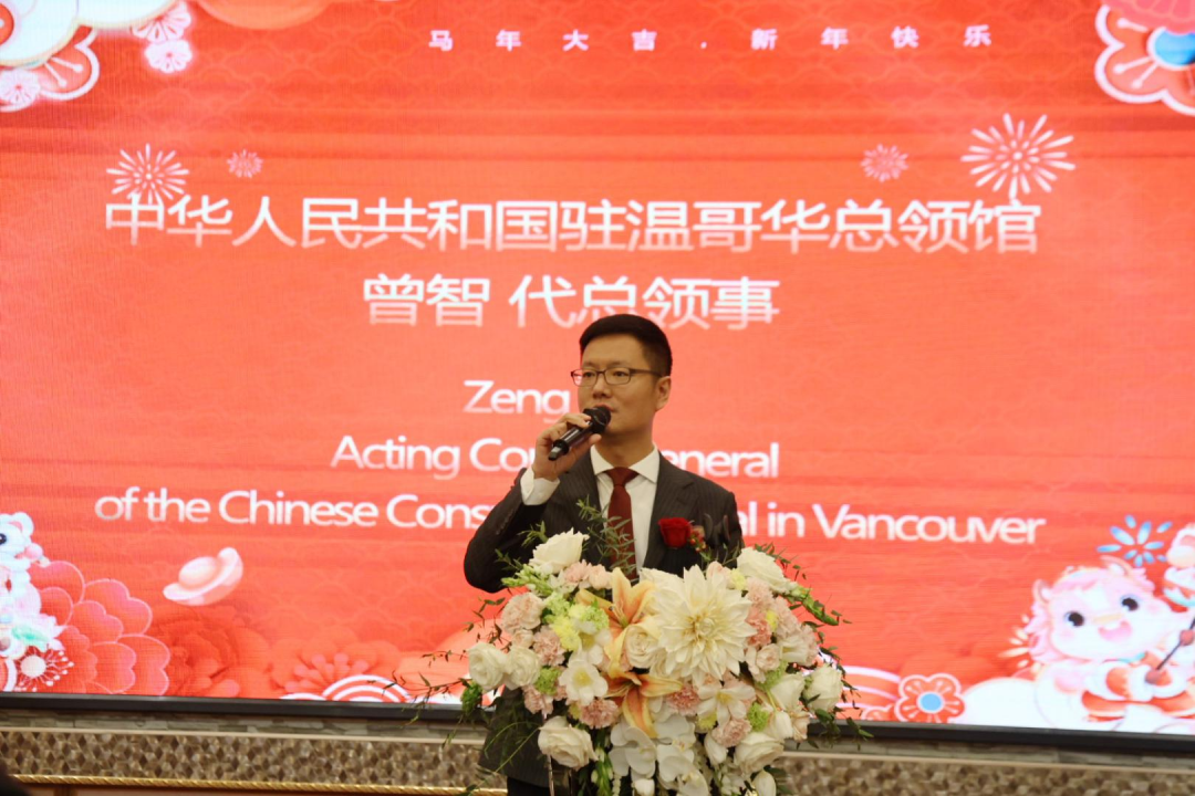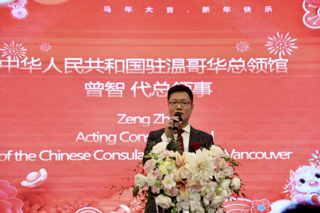 中国驻温哥华总领馆曾智代总领事的致辞,为本场庆典注入了真挚而温暖的情感深度。他微笑着用一句地道的四川话“大家好,新年好”开场,瞬间拉近了与全场乡亲的距离,随后分享了一个动人的家庭故事。