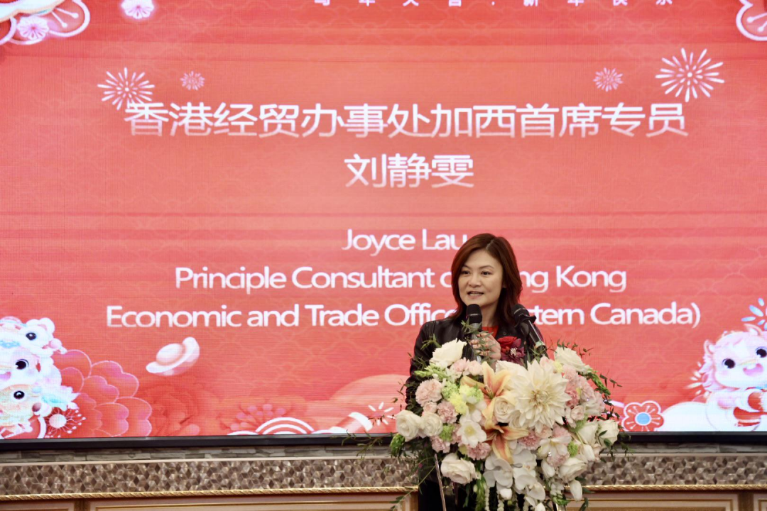 香港经贸办事处加西首席专员刘静雯女士在致辞中,特别强调了香港与四川长久以来的紧密联系,以及香港作为国际枢纽,在促进包括四川在内的中国各省份与加拿大交流合作中的独特角色。她祝愿同乡总会继续发挥桥梁作用,共创更多合作机遇。