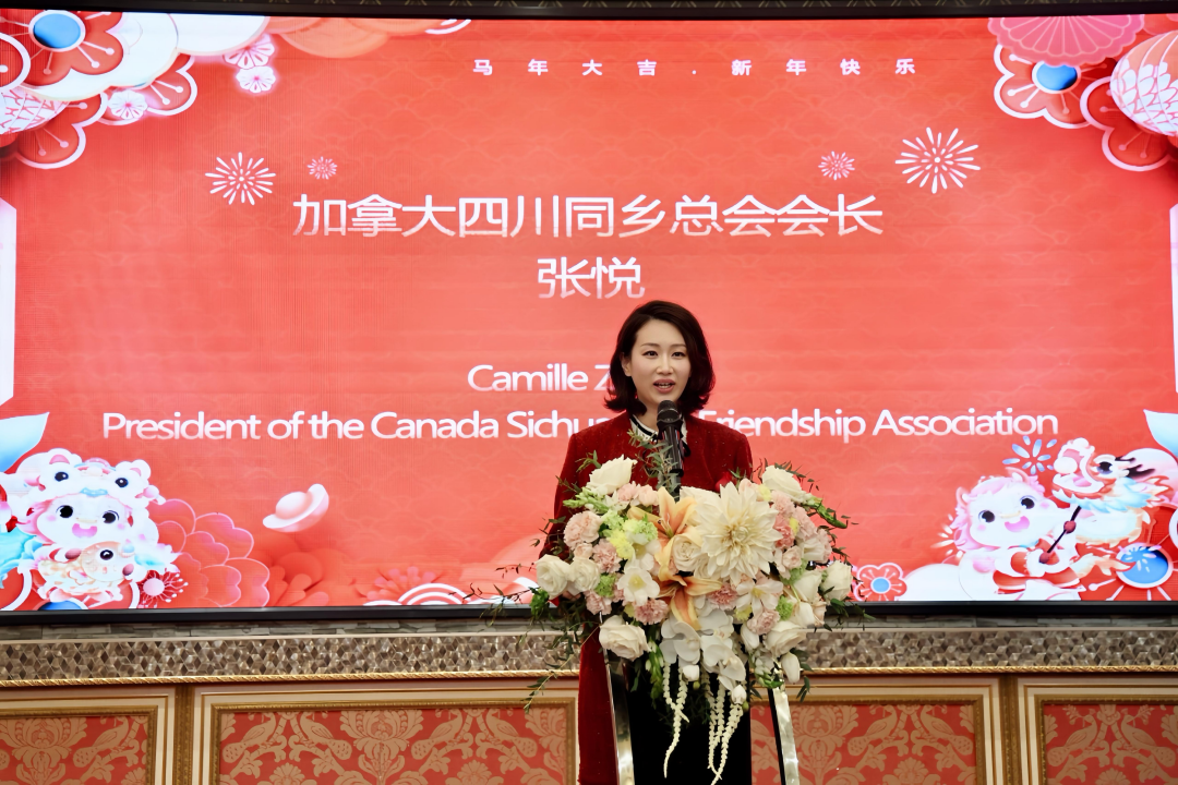 新任会长张悦女士在致辞中,首先向各位嘉宾与乡亲们致以热烈欢迎与诚挚祝福。她深情回顾道:“三十年前,我们怀着对故乡的思念与对未来的期许,在这片异国他乡的土地上,携手成立了加拿大四川同乡总会。从那个有着共同乡音的小聚会,到今天成为在加拿大极具影响力的四川籍社团,我们一路走来,不忘初心,用真情联结乡亲、用行动服务社区。”