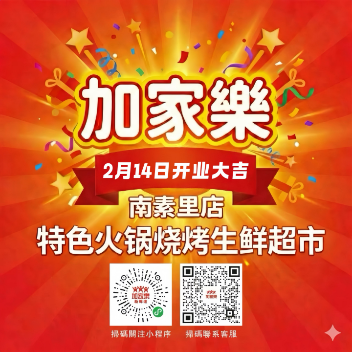 [加拿大乐活网lahoo.ca 讯] 2026年2月14日,农历大年初十七,恰逢西方情人节,加家樂特色火锅烧烤专卖南素里分店在一片喜庆祥和中盛大开业。这一集火锅烧烤食材、锅具及配料于一体的一站式专营店正式落户社区,为南素里及白石地区的华人朋友带来了地道的家乡风味和极大的生活便利。