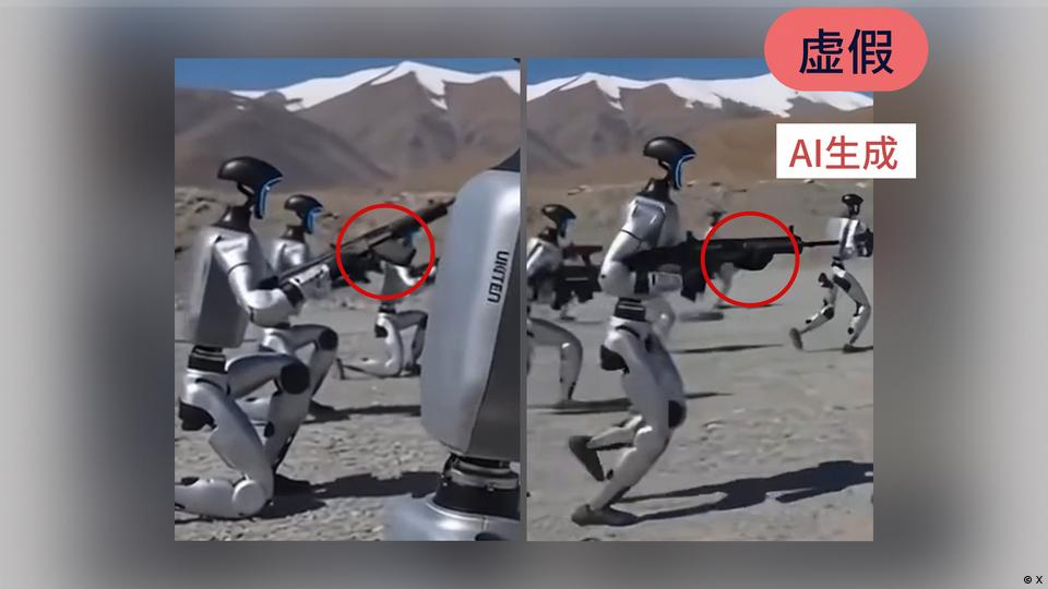 目前流传的这些“机器人士兵”视频都是由人工智能生成的。不过,中国确实正朝着在日常生活中使用人形机器人的方向发展,其中也包括协助安保。大约一年前,中国媒体曾报道,人形机器人在深圳街头与警察一起巡逻。 在中国多个大城市,如成都、武汉或上海,此类机器人被用于协助管理交通,或正在接受相关训练。