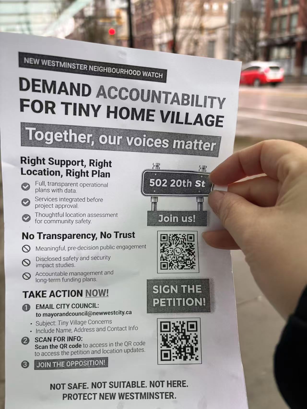 近日,我参加了新西敏一场由 BC Housing 举办的 “Tiny Home Village” 项目说明会。项目计划建设约 30 个可移动小型房屋,用于安置无家可归者,属于“低门槛”类别。项目推进迅速,但争议同样迅速扩大——说明会当天,场外已有居民抗议。