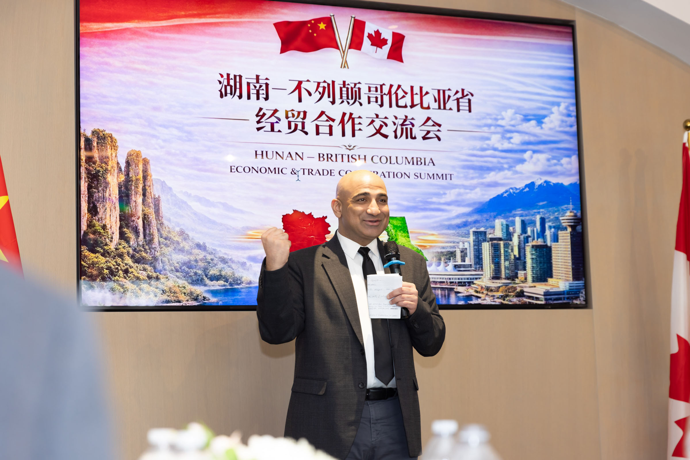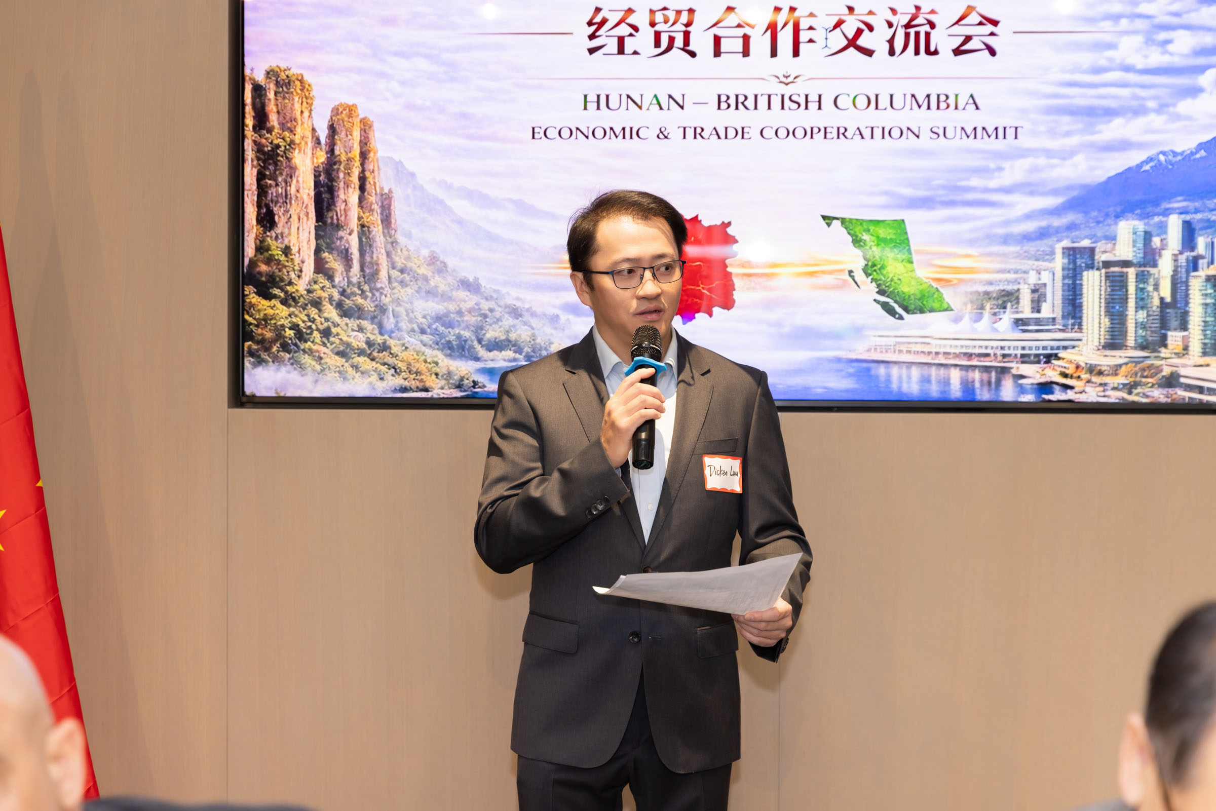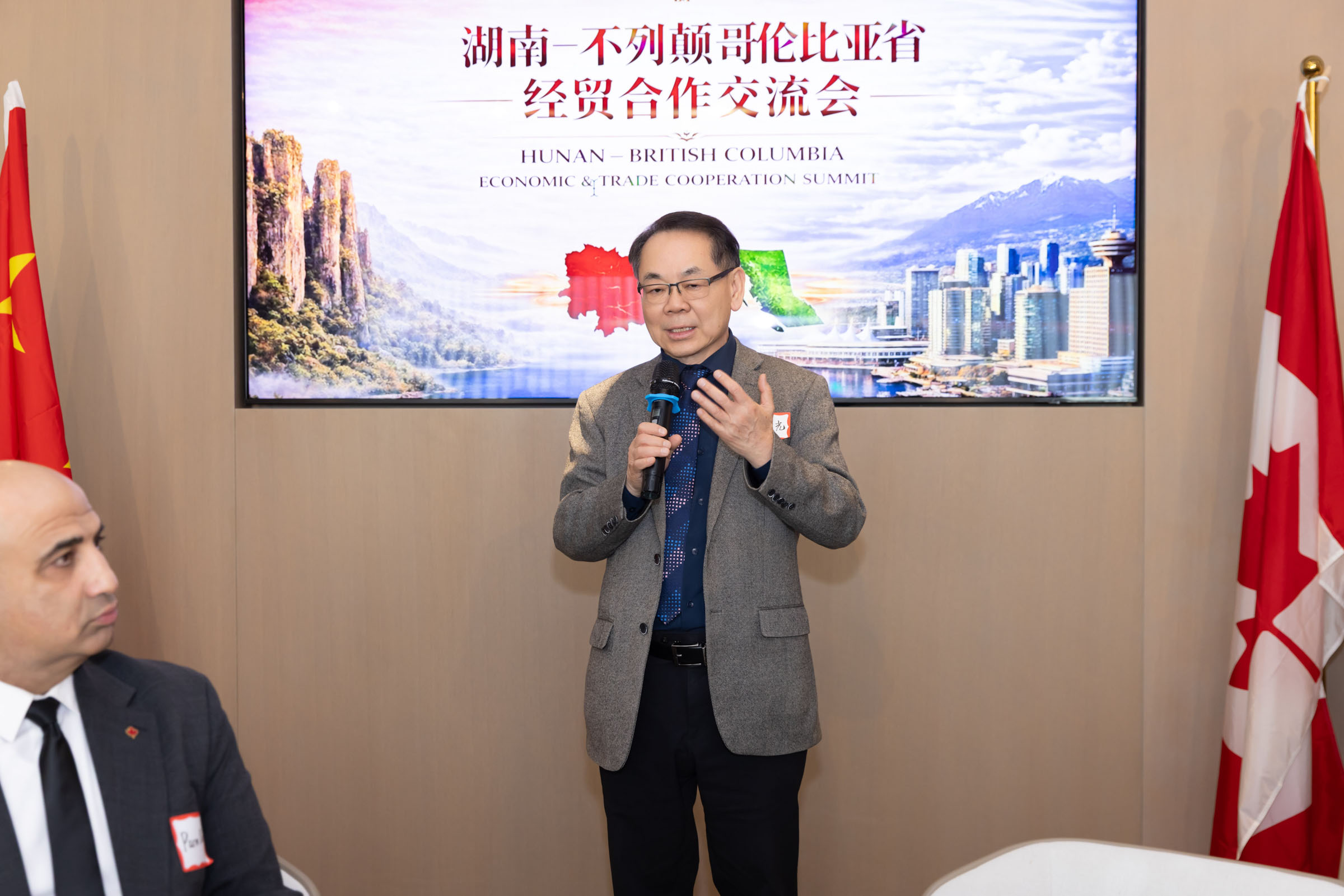 Paul Choi在致辞中代表省政府欢迎湖南代表团到访,并感谢主办方的组织工作。他表示,卑诗省作为加拿大通往亚太的重要门户,正积极推动经济多元化发展,与中国在经贸及科技领域具备良好合作基础与广阔前景。他指出,应进一步加强企业间对接与务实合作,深化交流,共同推动双方经济实现持续增长与互利共赢。